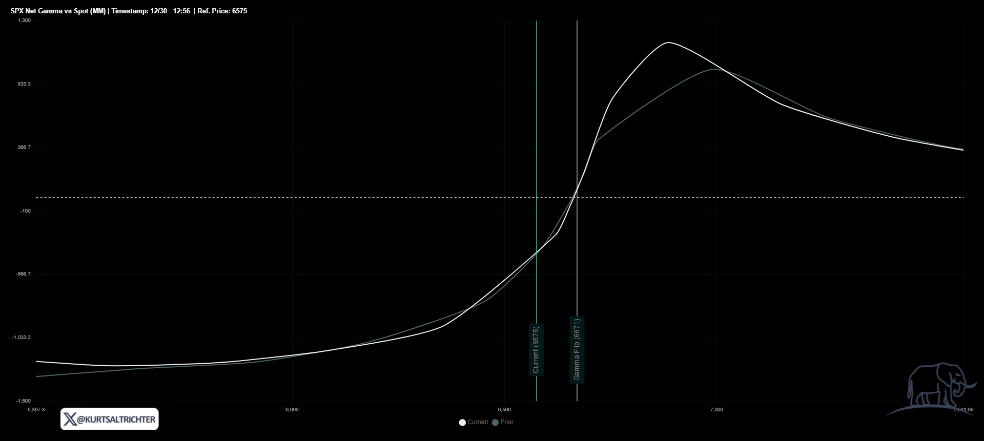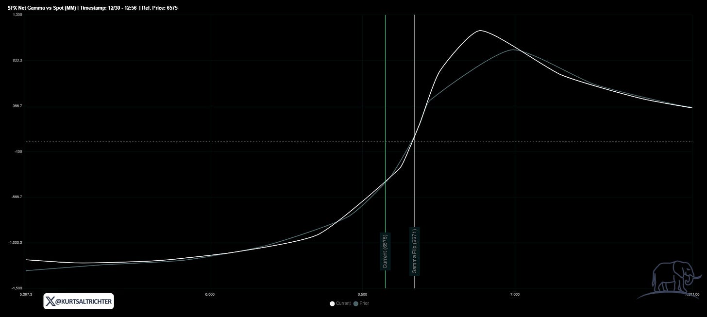 Right now, with SPX roughly 1.5% percent below the flip, dealers are mechanically selling into weakness and buying into strength. That behavior accelerates both downside and upside moves, which is why markets often feel faster, more erratic, and harder to fade in negative gamma conditions.