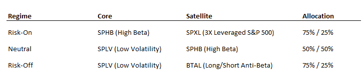 Risk-Off: 75% SPLV and 25% BTAL, which provides a market-neutral hedge that benefits when high-beta equities underperform.