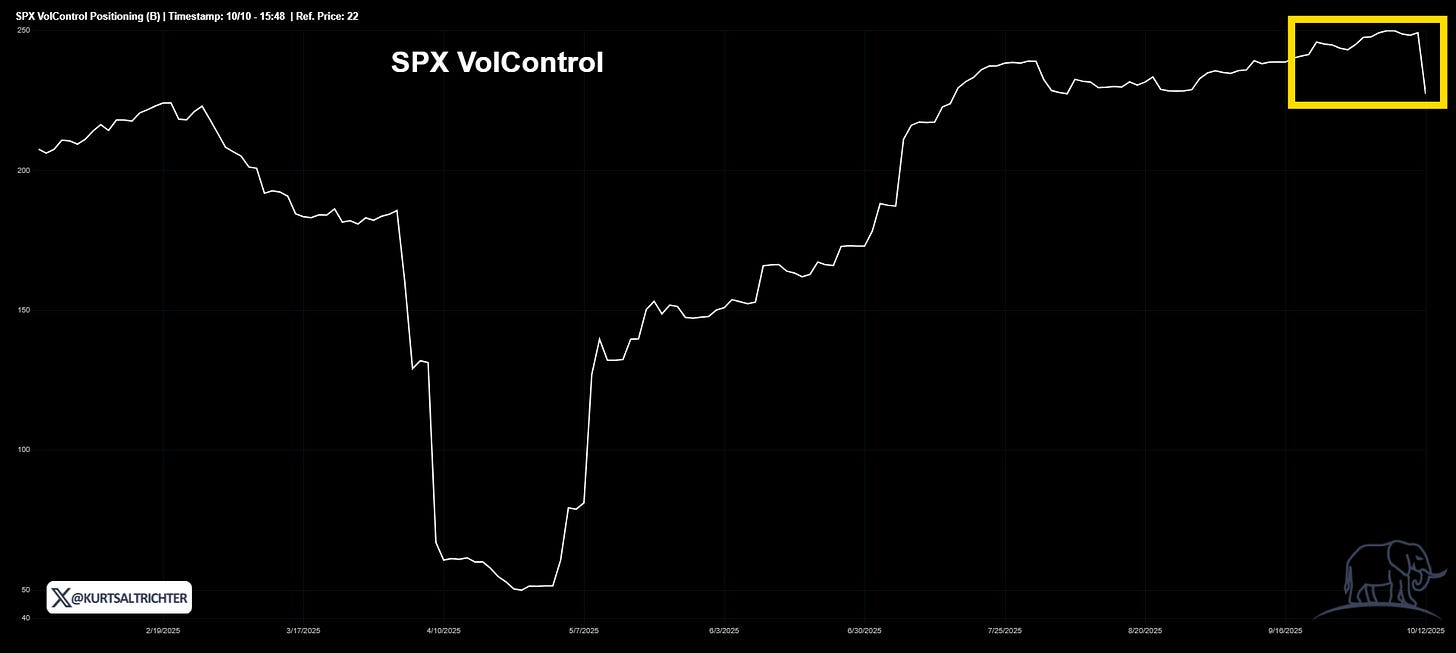When realized volatility rises this quickly, it tells us that price swings over the past month just expanded dramatically. It’s not about one big down day; it’s about how that day changes the trailing window of returns. This matters because volatility-targeting strategies, vol-control funds, and risk-parity models all key off realized volatility.