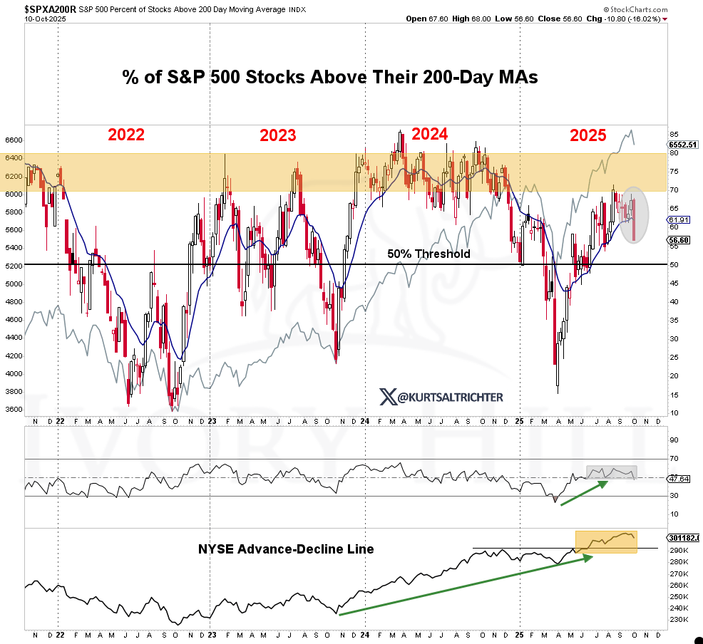 About 56.6% of S&P 500 stocks remain above their 200-day moving average. Breadth has flattened after improving steadily through September. This plateau means that while leadership stocks remain strong, participation under the surface has stopped expanding.