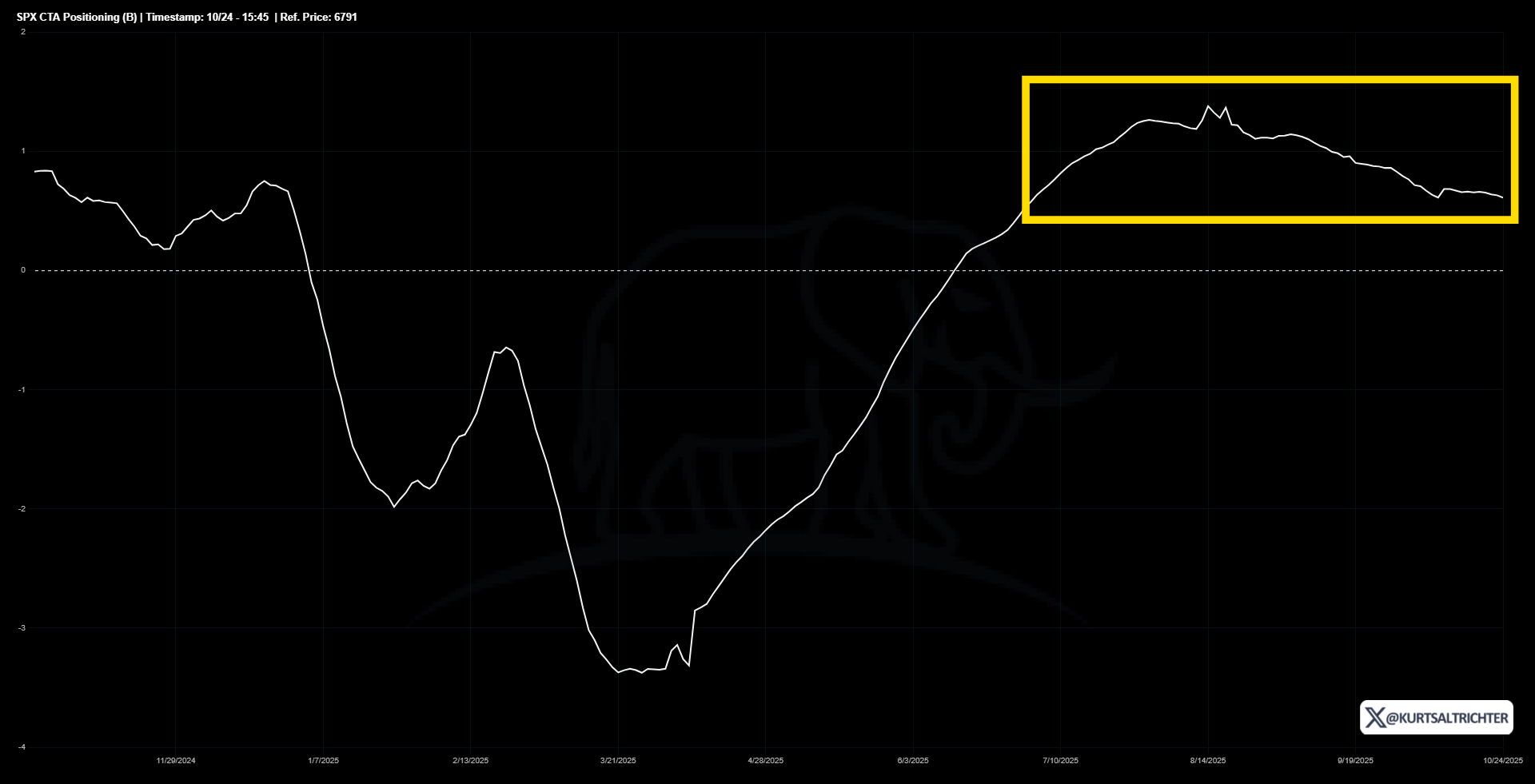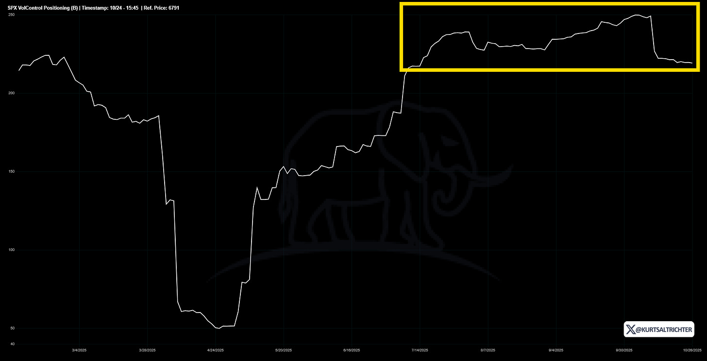 Vol Control exposure stabilized as realized volatility cooled from the early October surge. CTA positioning held steady with no broad selling impulse. The combination removes the mechanical selling overhang and allows price to respond more cleanly to improving gamma and breadth. We are not out of the woods here until both lines start pointing up.