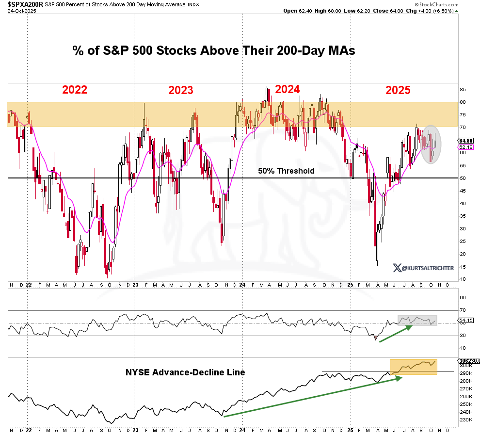 The percentage of S&P 500 stocks above the 200-day moving average is about 64.8 percent. That is an improvement from the prior week and sits just under the stronger confirmation zone in the mid to high sixties. Direction of change matters. Participation broadened and supports the Risk-On composite read.