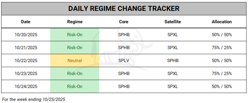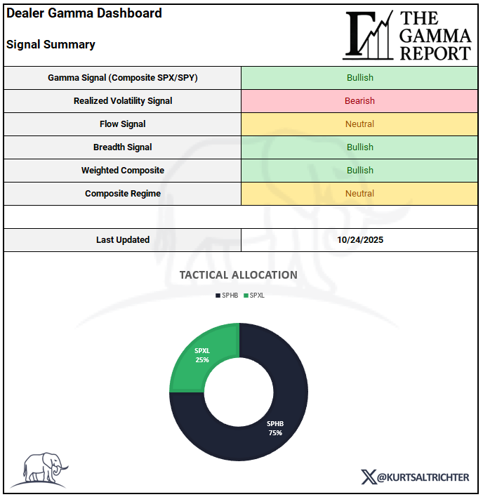 The model flipped to Risk-On into the Friday close. Volatility eased from the early month spike but remains active. Dealer positioning improved as spot pushed through key flip levels. Systematic flows are stabilizing, and breadth continued to firm. The model now favors 75% SPHB and 25% SPXL.