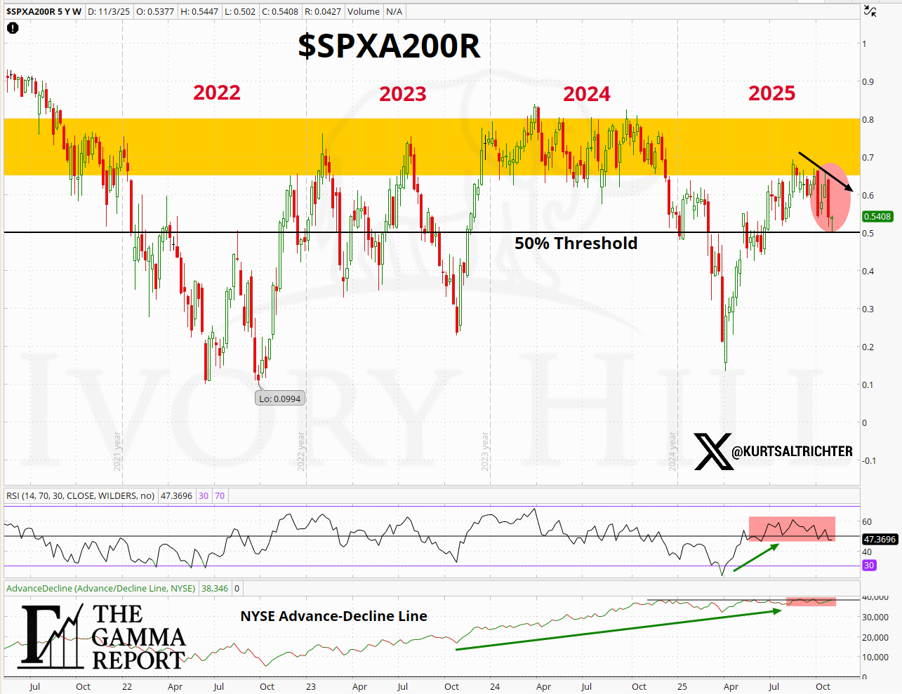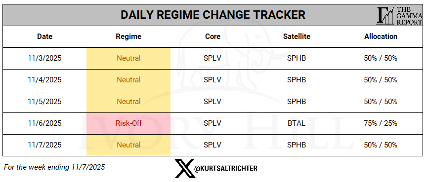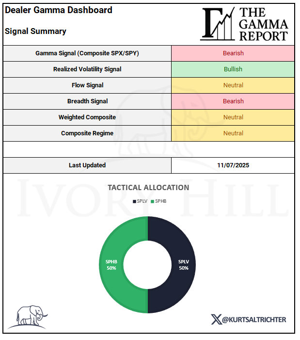 Gamma is soft. Breadth is slipping. The trend is weakening. Realized vol is firmer but not yet disruptive. That combination does not call for big offense moves or panic selling. It calls for staying balanced and letting the model dictate exposure instead of using your emotions.