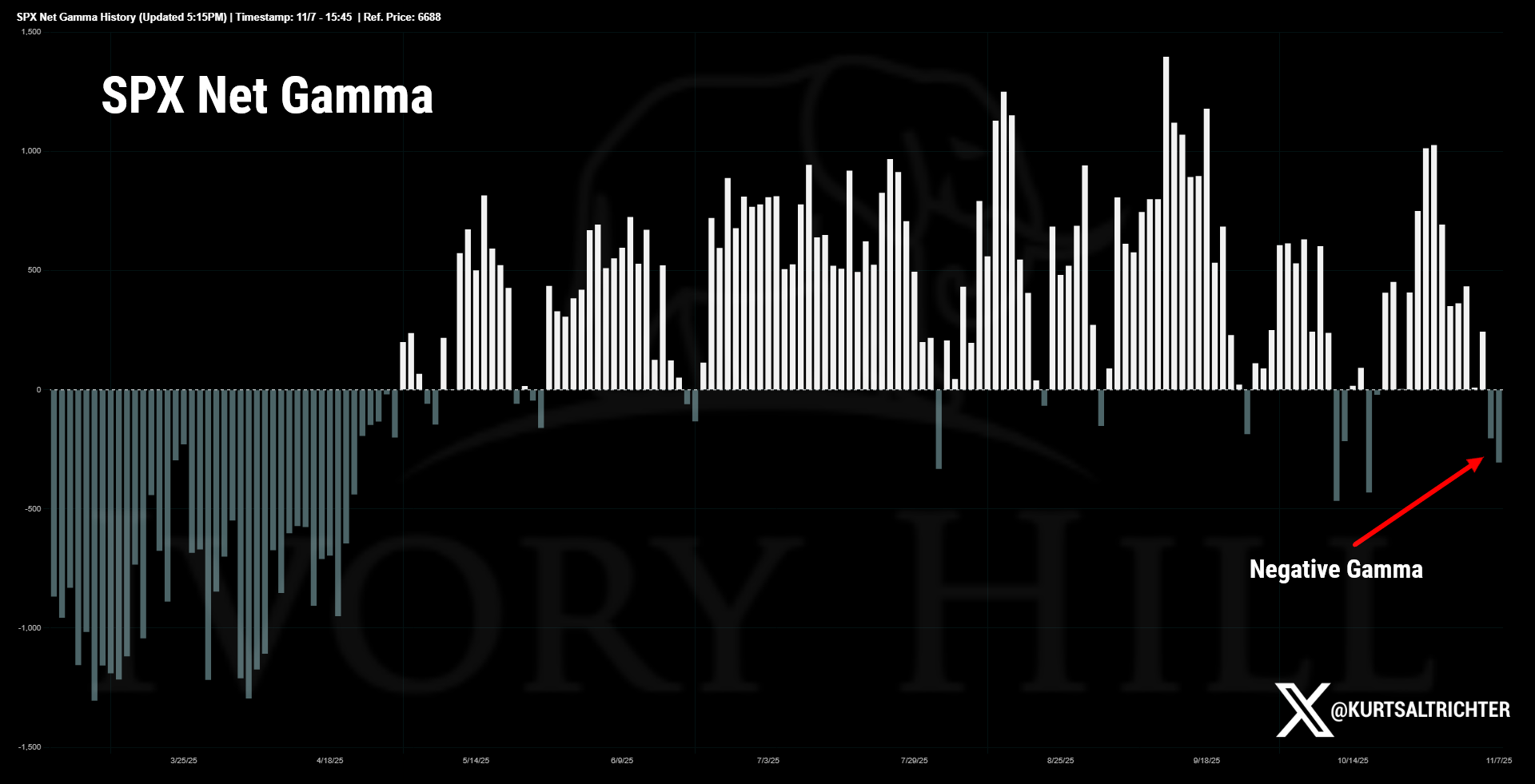 Dealers moved into negative gamma last week. This move matters because it is a regime change. Now that dealers are short gamma relative to spot, they must hedge in the direction of price. When the market trades lower, they sell into weakness. When it trades higher, they have to buy into strength. Flows are more erratic in this environment. Price gets amplified, not suppressed.