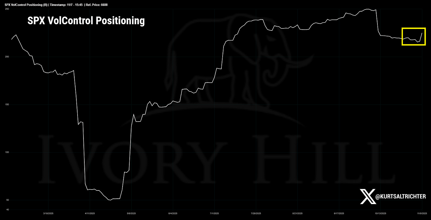 Higher realized volatility means the market actually moved more last week than it did the prior week. However, these levels are still not high enough to force VolControl models to reduce exposure. They only cut when realized volatility jumps sharply. That hasn’t happened yet.