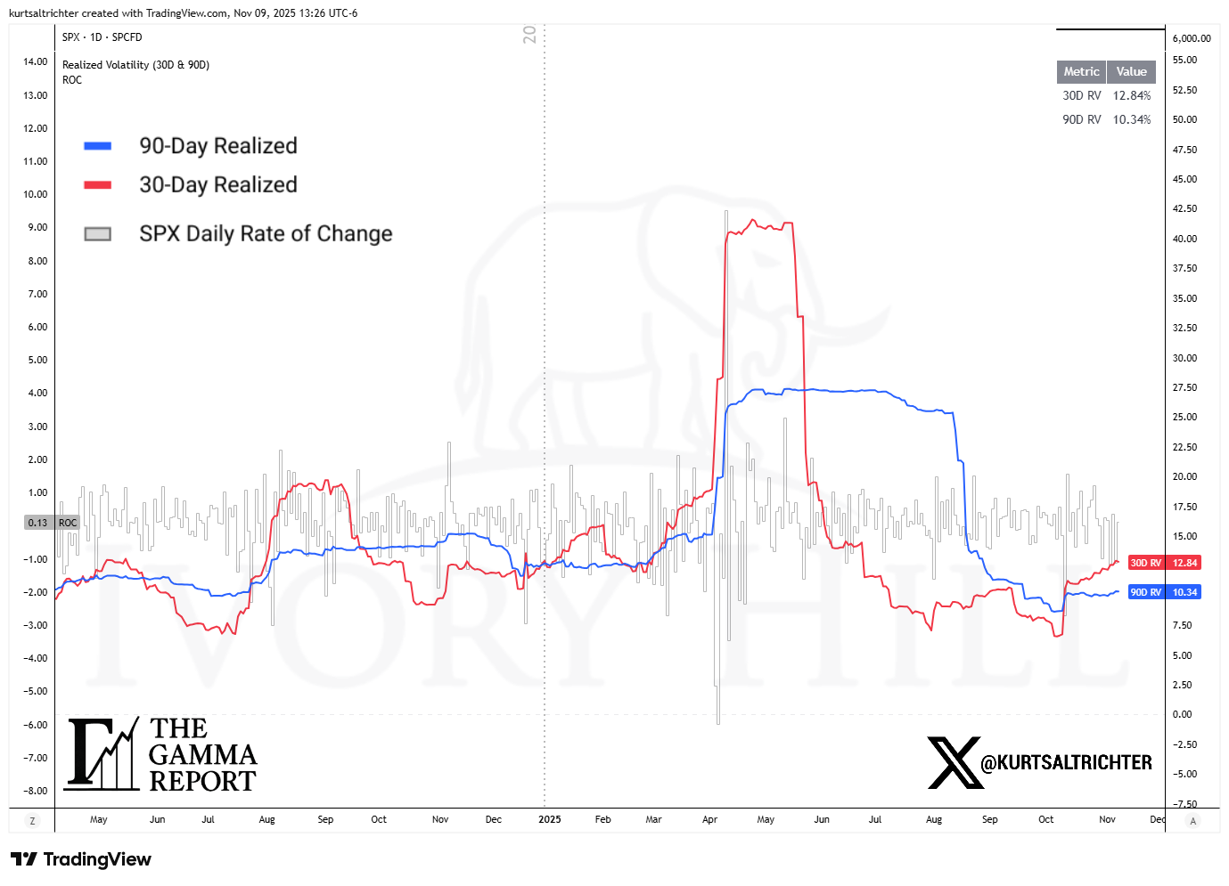 30-day realized volatility finished this week at 12.84, up from 12.22 last week. 90-day finished at 10.34 versus 10.03 last week. Both readings increased from last week.