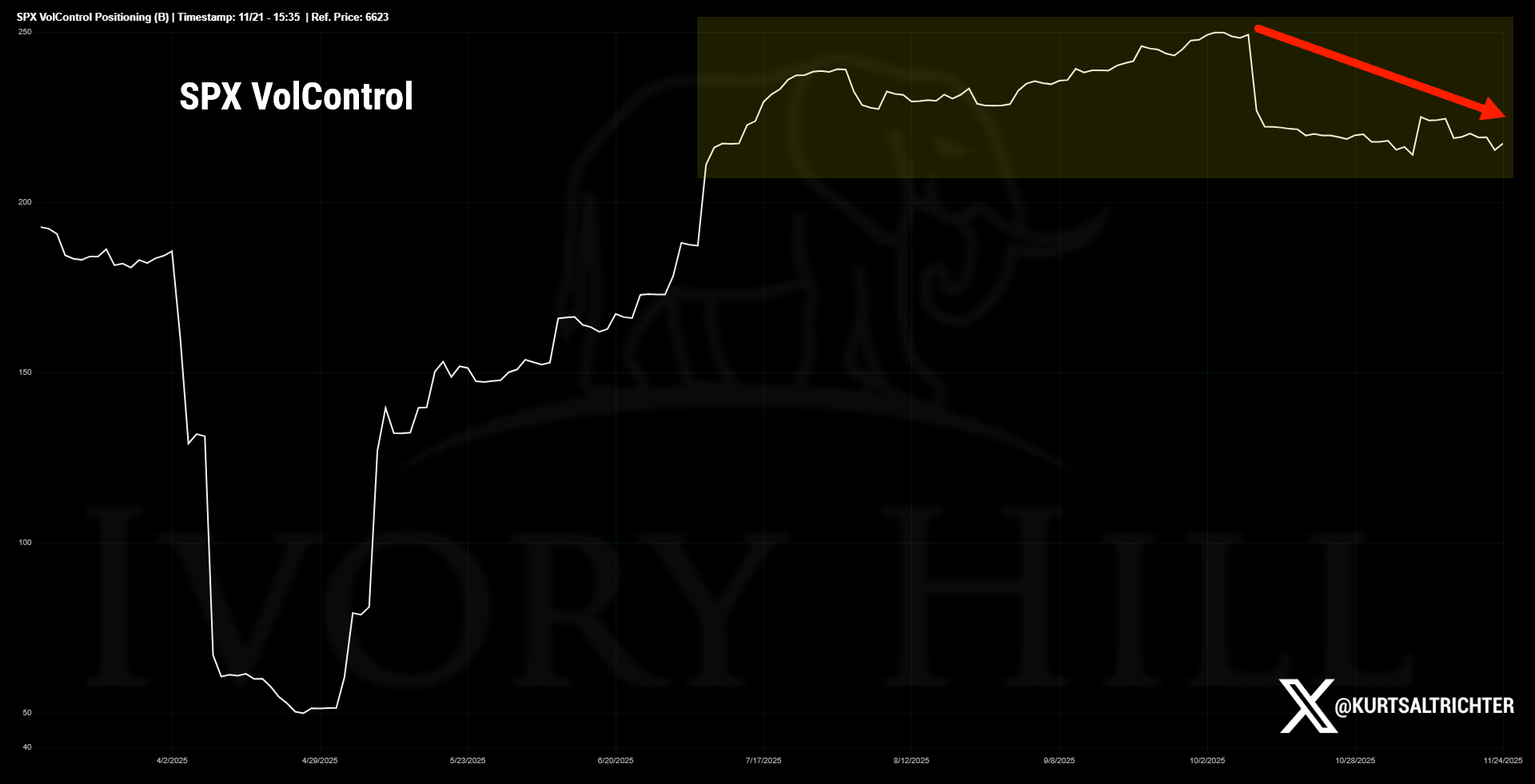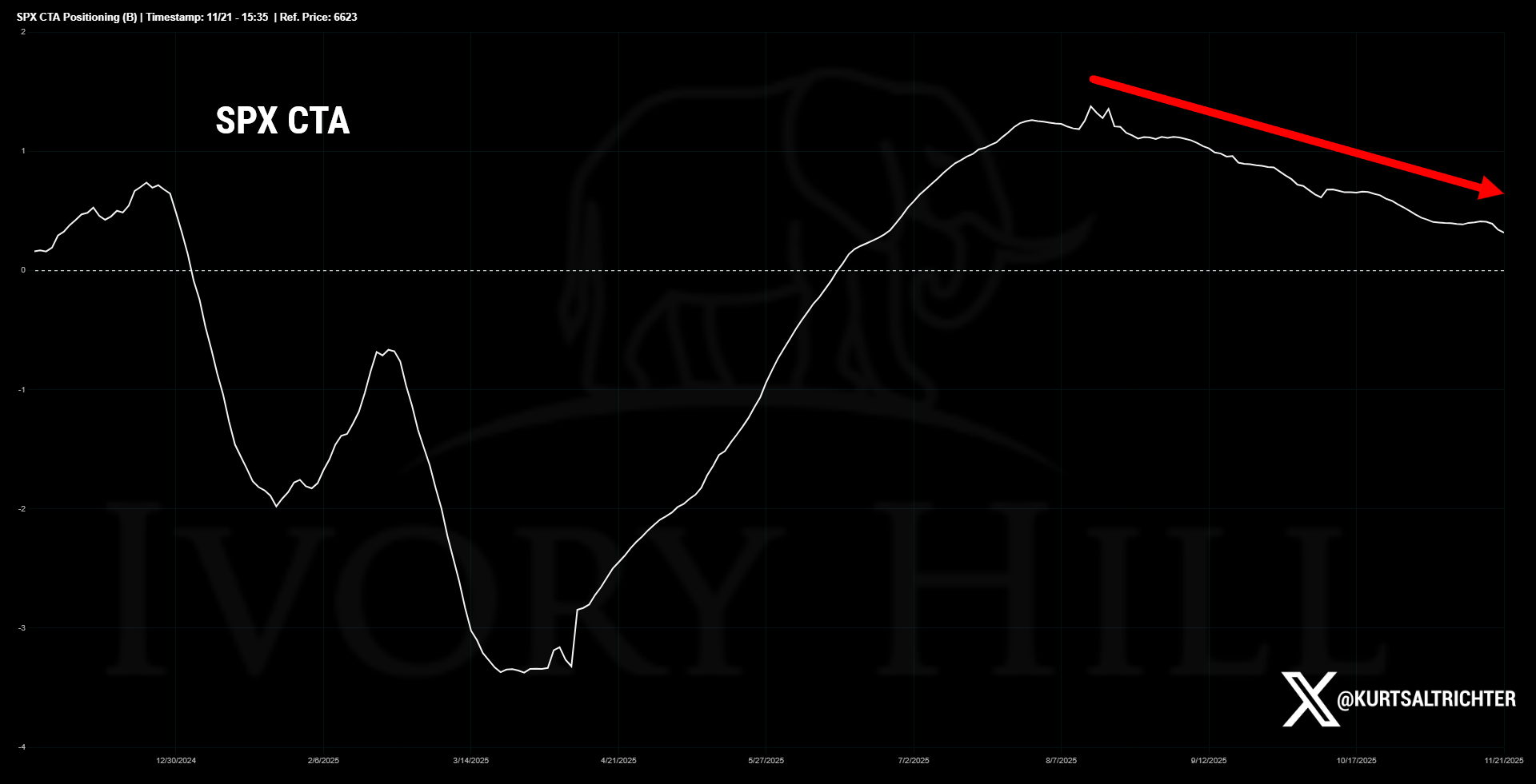 CTA positioning in SPX has been bleeding lower from strong net long for weeks. They are still long, but their exposure has drifted down toward the middle of the historical range. That removes one of the big incremental buyers that helped push the market to the recent all-time-highs.