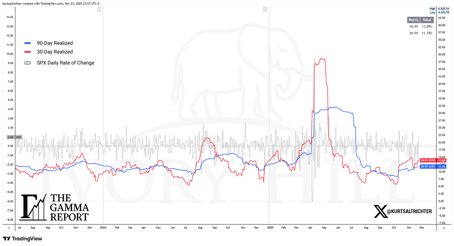 On the volatility side, 30-day realized volatility ended the week at 13.89, up from 12.55 the prior week. 90-day realized volatility finished at 11.78, slightly higher than 11.40. The message is simple: realized vol is grinding higher, not rolling over.