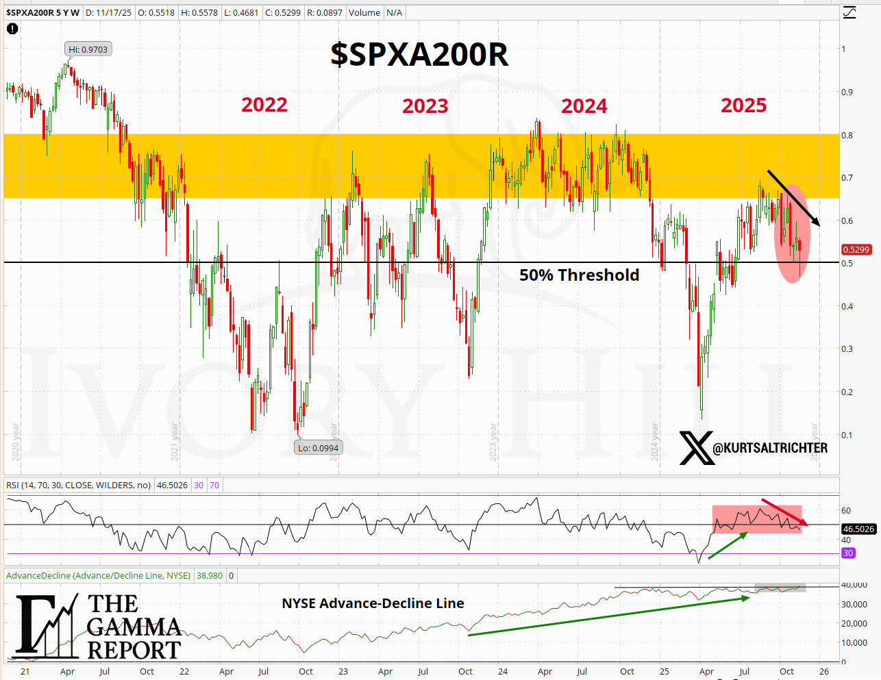 The SPXA200R gauge failed again in the same congestion zone that has capped advances since 2022. RSI for the breadth index rolled over from overbought and now sits in the mid-40s, while the NYSE advance-decline line is flattening inside a tight range. When the index hovers near new highs but fewer names participate, the market becomes top-heavy. That is the environment where negative gamma and rising realized vol matter more.