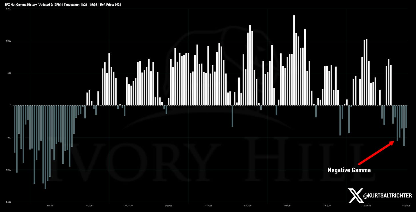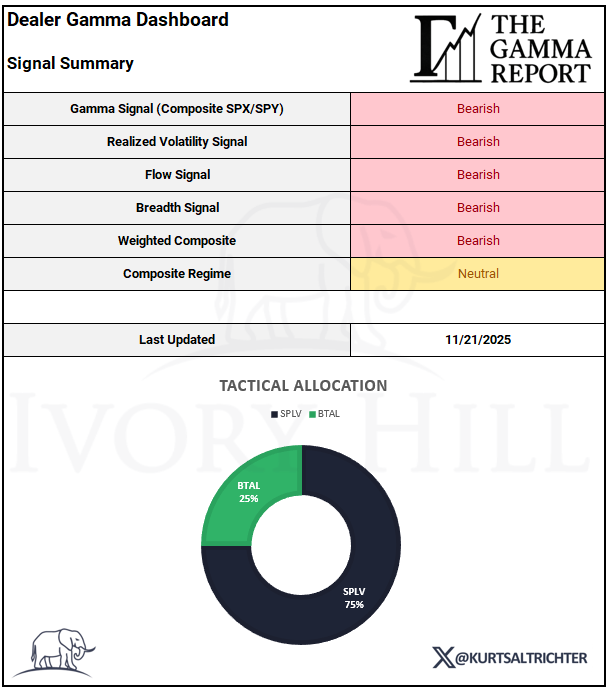 Both groups still provide some support, but far less than they did earlier in the quarter. When CTAs are trimming and vol control is stepping back, the tape becomes more dependent on discretionary flows and dealer hedging. With dealers now in negative gamma, that setup leans bearish. The flow signal moves from Neutral to Bearish. Remember, negative gamma doesn’t mean we'll automatically get a down market. It means volatility gets more ferocious on both the upside and the downside.