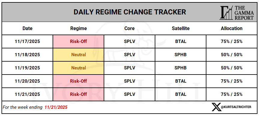 The regime shifted back to Risk Off by the end of the week, which aligns with the deepening negative gamma, rising realized volatility, and softer systematic support.