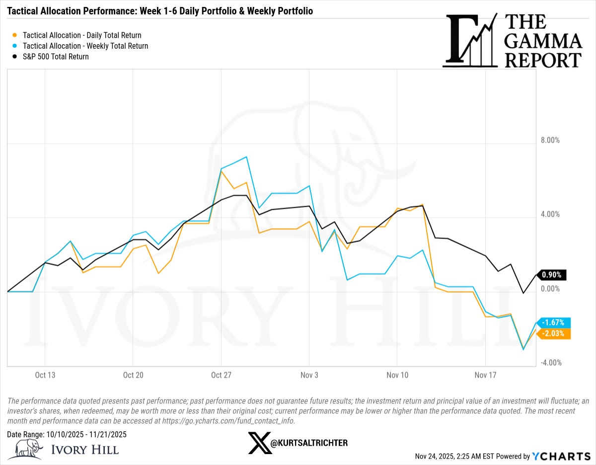 Since the start of the tactical allocation series on October 10, the S&P 500 is up about 0.90%. The weekly rebalanced tactical portfolio is down roughly 1.67%, while the daily version is down about 2.03%.