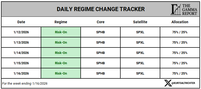 The regime remains Risk On, with a 75% core allocation to SPHB and 25% satellite allocation to SPXL.