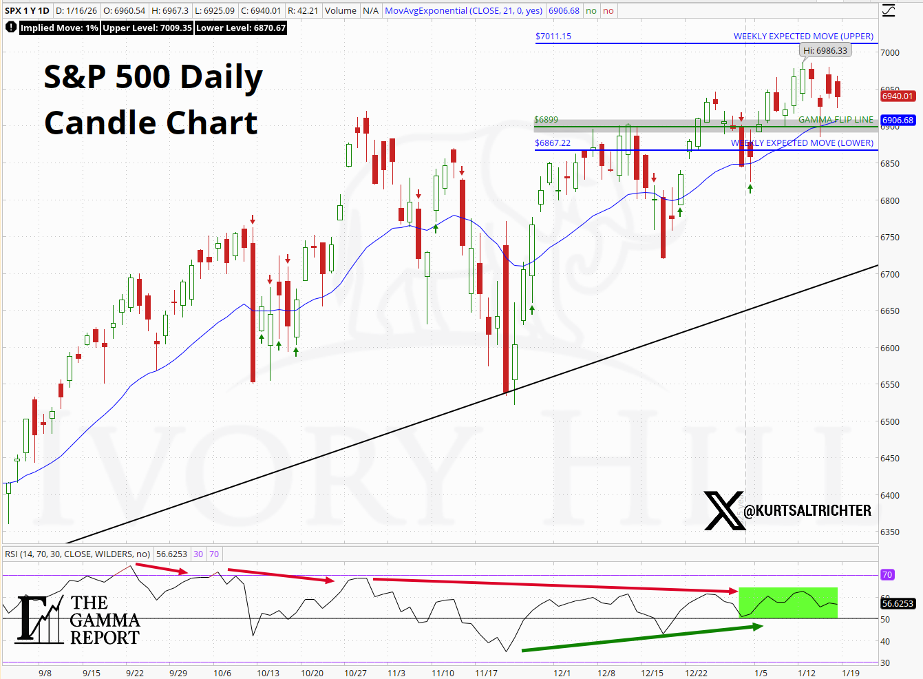 The S&P 500 closed the week at 6940, sitting just above the gamma flip line near 6899.