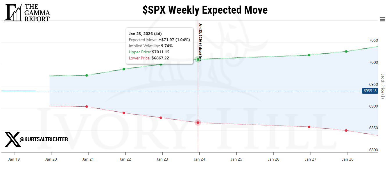 The weekly expected move for the coming week is approximately ±1.04%, with an upper bound near 7011 and a lower bound near 6867.