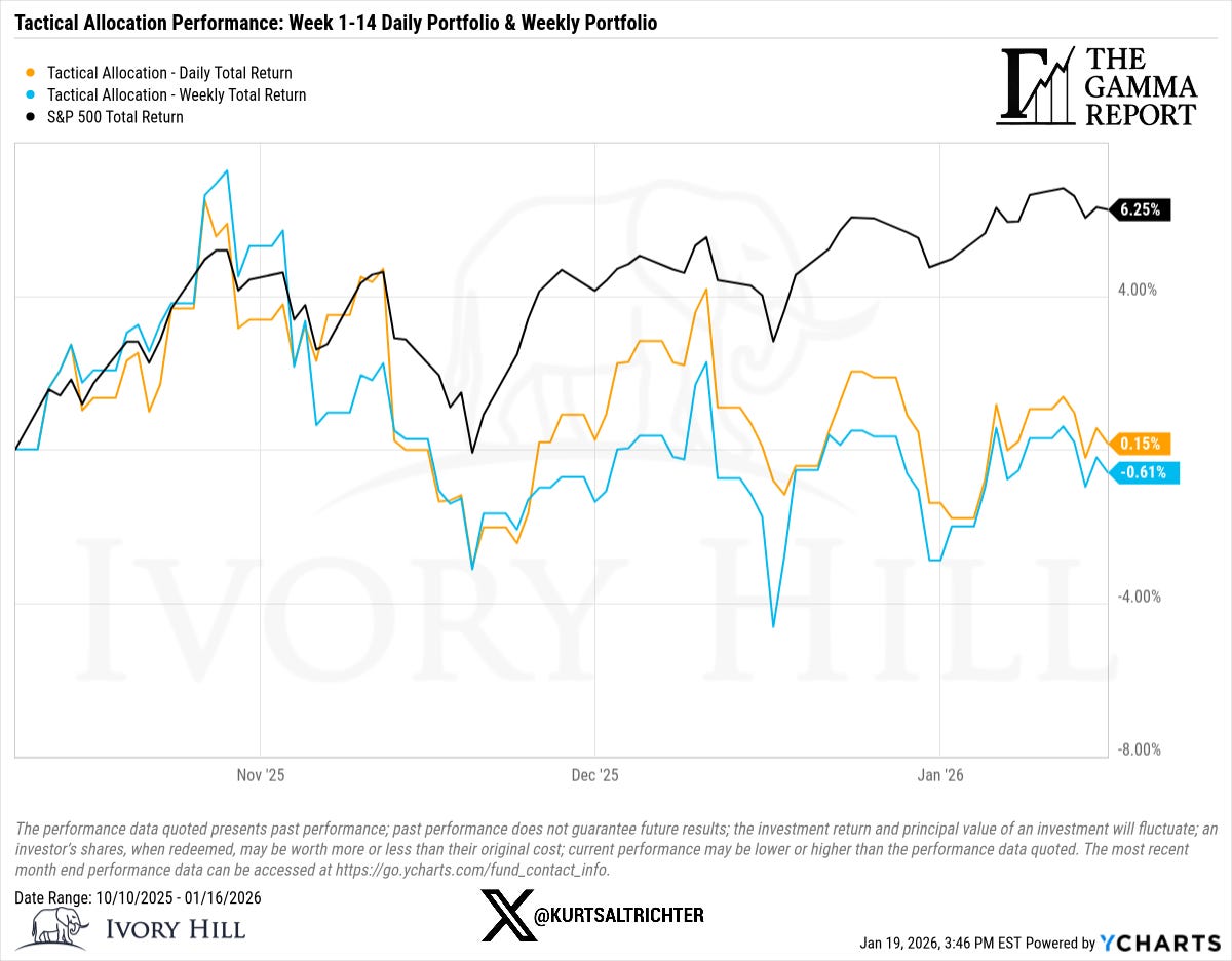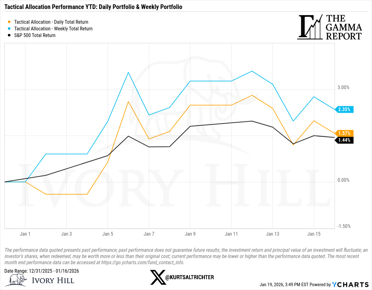 Year to date, the tactical allocation has delivered 1.57%, compared with 1.44% for the S&P 500 over the same period. The weekly portfolio sits higher at 2.35%, reflecting the benefit of regime consistency and volatility control.