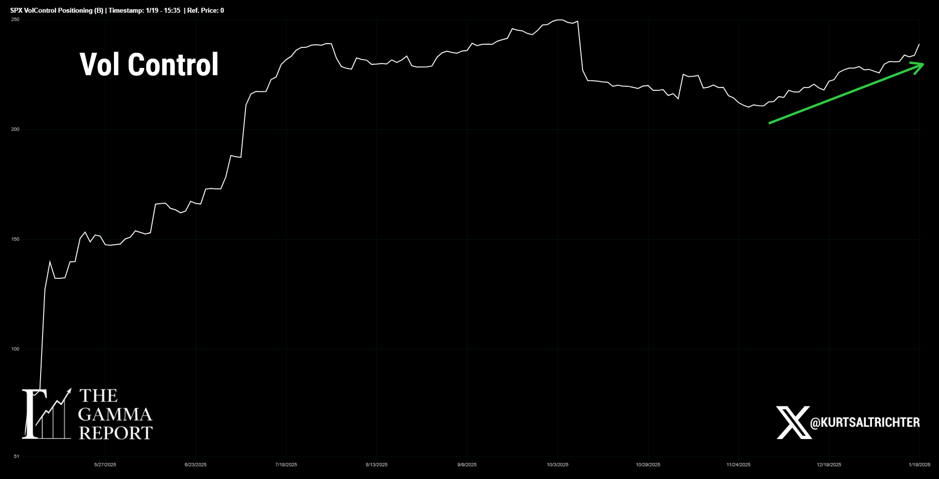 Vol control strategies have responded exactly as expected. Exposure has been rebuilding steadily after the late 2025 drawdown. That acts as a slow, persistent buyer beneath the market.