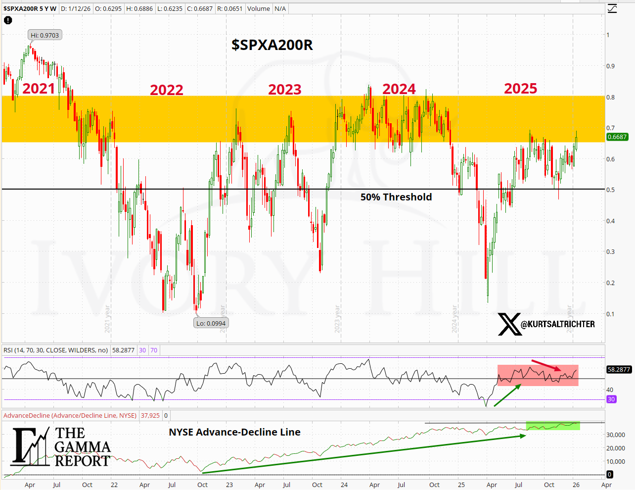 The advance-decline line continues to hold its uptrend and remains near cycle highs. That confirms participation beneath the surface, even as index-level momentum slows.