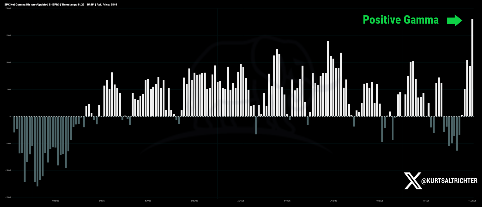 The gamma history this quarter tells the story. We went from deeply negative readings in October to a shallow negative pocket into mid-November, and finally to a sharp ramp into positive territory by the end of last week. The structure shifted from amplifying every wiggle to leaning against moves.