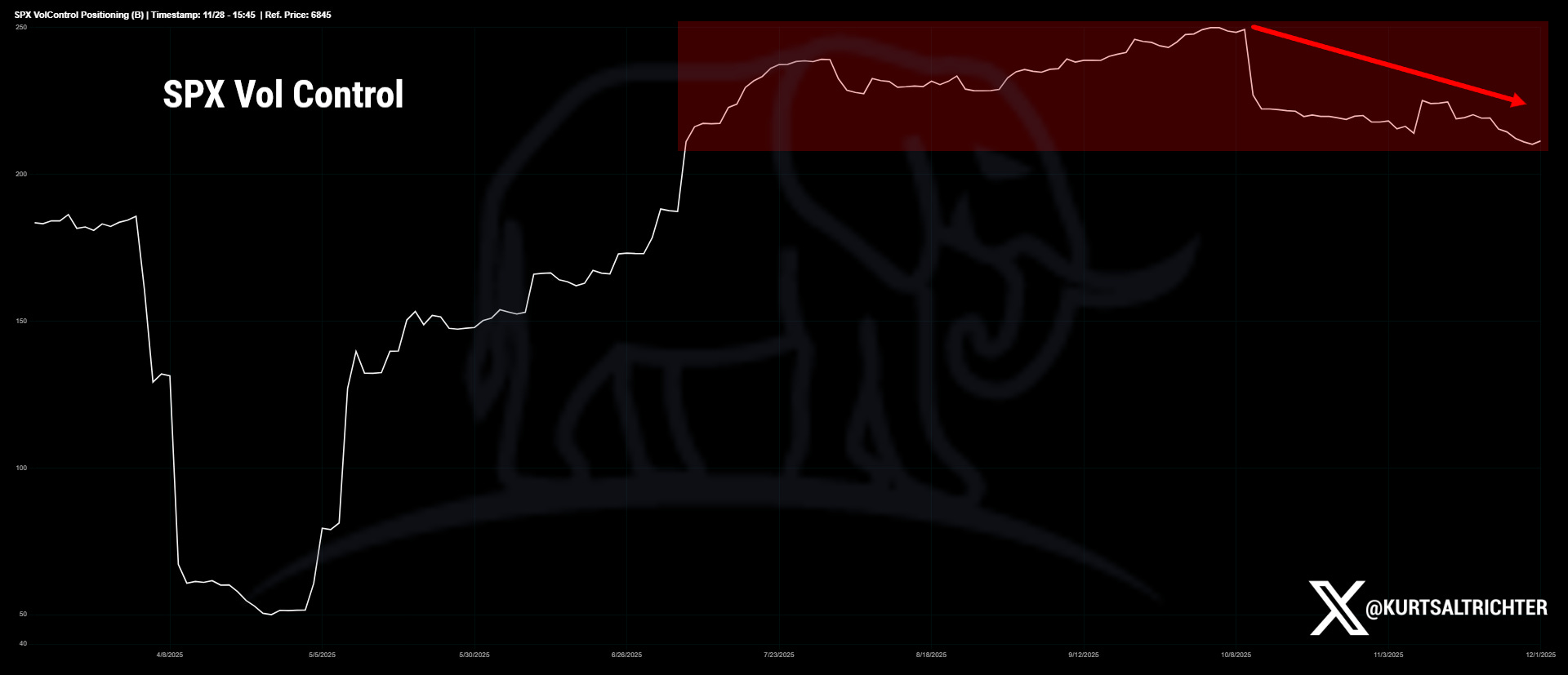 Vol control exposure followed a similar arc. After ramping aggressively as realized vol collapsed earlier in the year, the notional line flattened out, peaked, and has now started to roll over. The red-shaded zone on the chart highlights the slow, steady reduction from the highs. These are not forced liquidations; they are the mechanical trimming that happens when realized vol drifts higher and the models move back toward their target band.