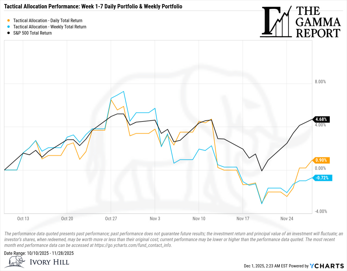 Earlier in November, both tactical sleeves were down relative to the index as the model respected negative gamma and rising realized vol while the tape tried to press higher. The last couple of weeks narrowed that gap. The daily sleeve flipped back into positive territory, while the weekly sleeve has only a small deficit.