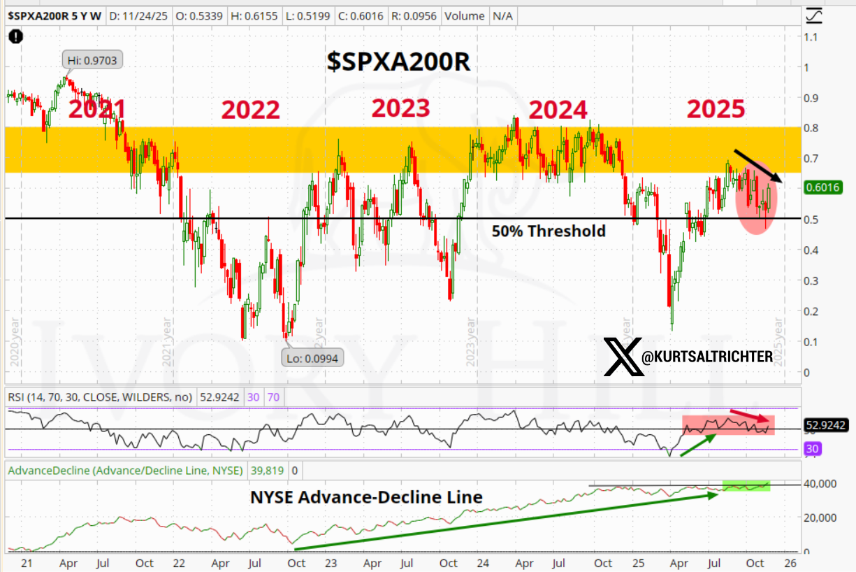 Roughly 60% of S&P 500 names now trade above their 200-day moving average, up from a trough near 52% earlier in the month. That sounds constructive, but the SPXA200R gauge is still pinned in the same congestion band that capped advances in 2022, 2023, and 2024. Every attempt to break higher has stalled in that yellow zone.