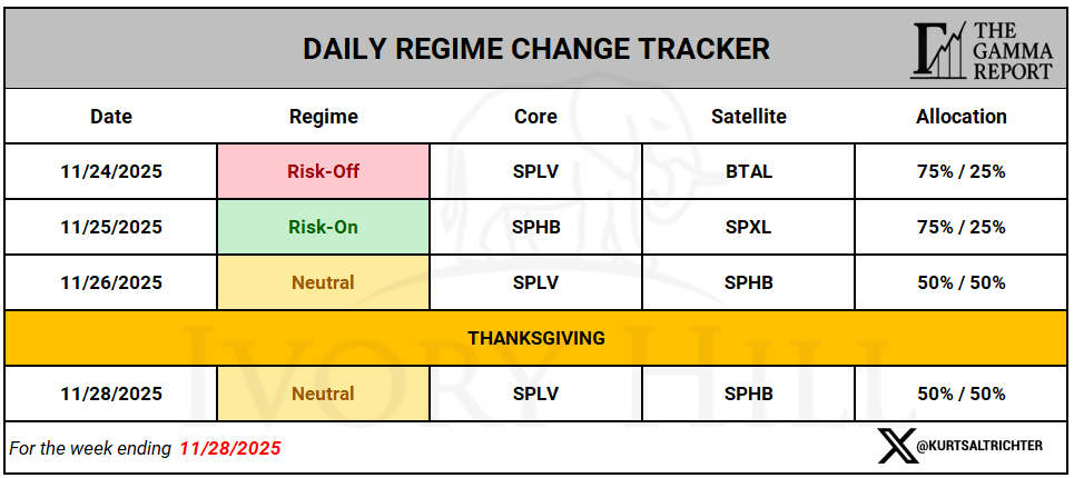 We started the week still in a Risk-Off posture that had been in place since the prior week’s negative gamma pocket. As gamma flipped and spot reclaimed the flip line, the model allowed us to step briefly into Risk-On, then settle into a Neutral mix by the close of the week.
