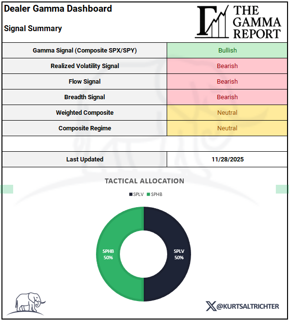 Last week, the weighted composite was negative, and the model sat in a full Risk Off posture, with SPLV and BTAL doing the heavy lifting. The swing back to Neutral did not come from healthier breadth or stronger flows; it came almost entirely from the shift in dealer gamma.