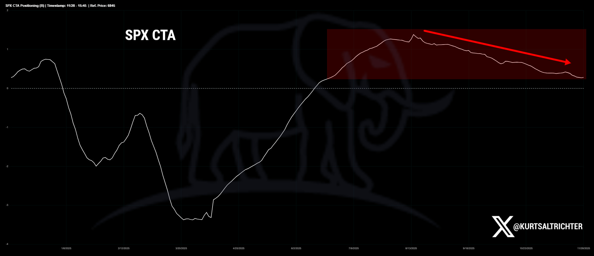 CTAs are still net long, but the exposure line has been drifting lower from its summer highs. That steady bleed pulls them closer to the middle of the historical range. When the trend is this mature, CTAs are no longer the incremental buyers they were when the move began.