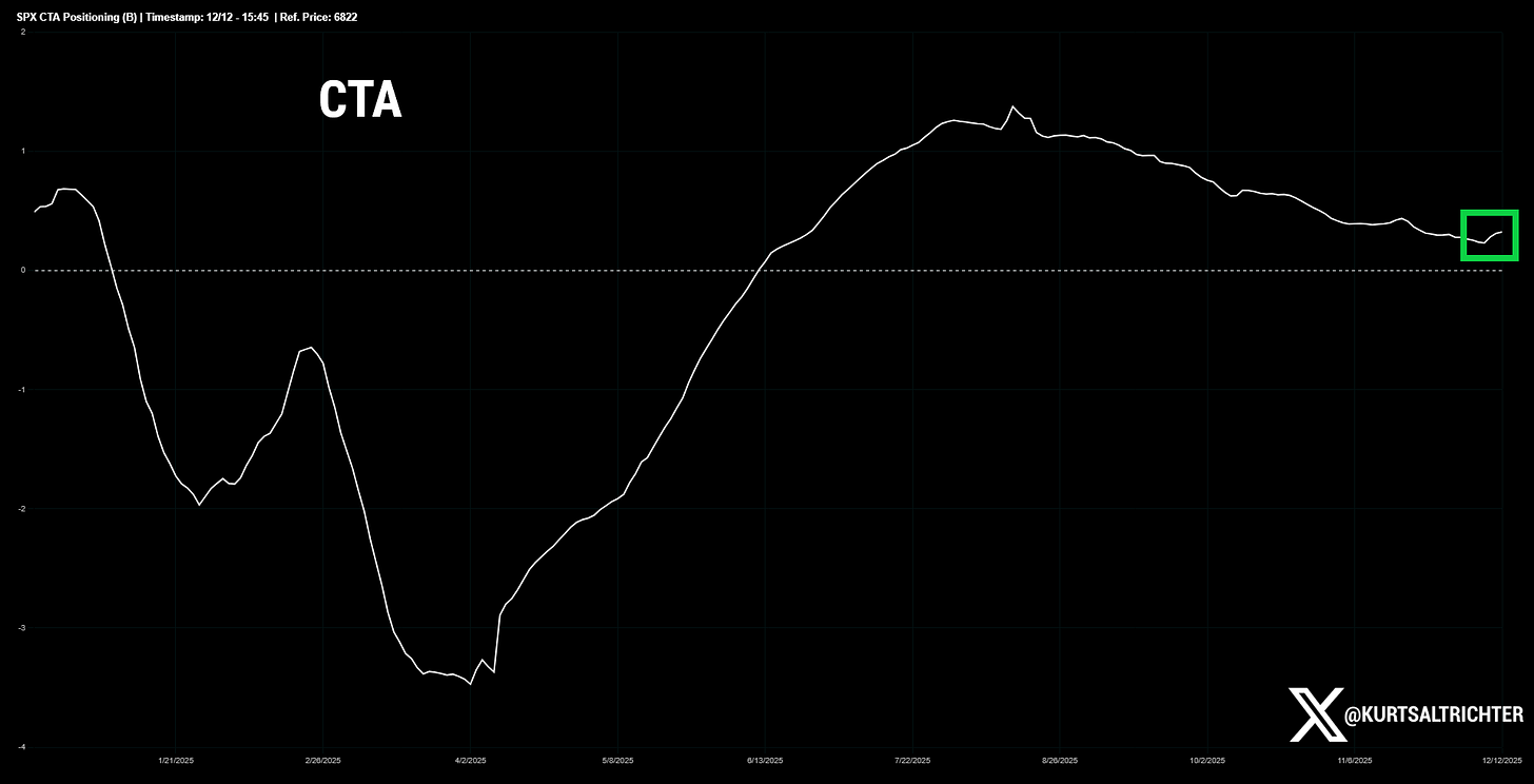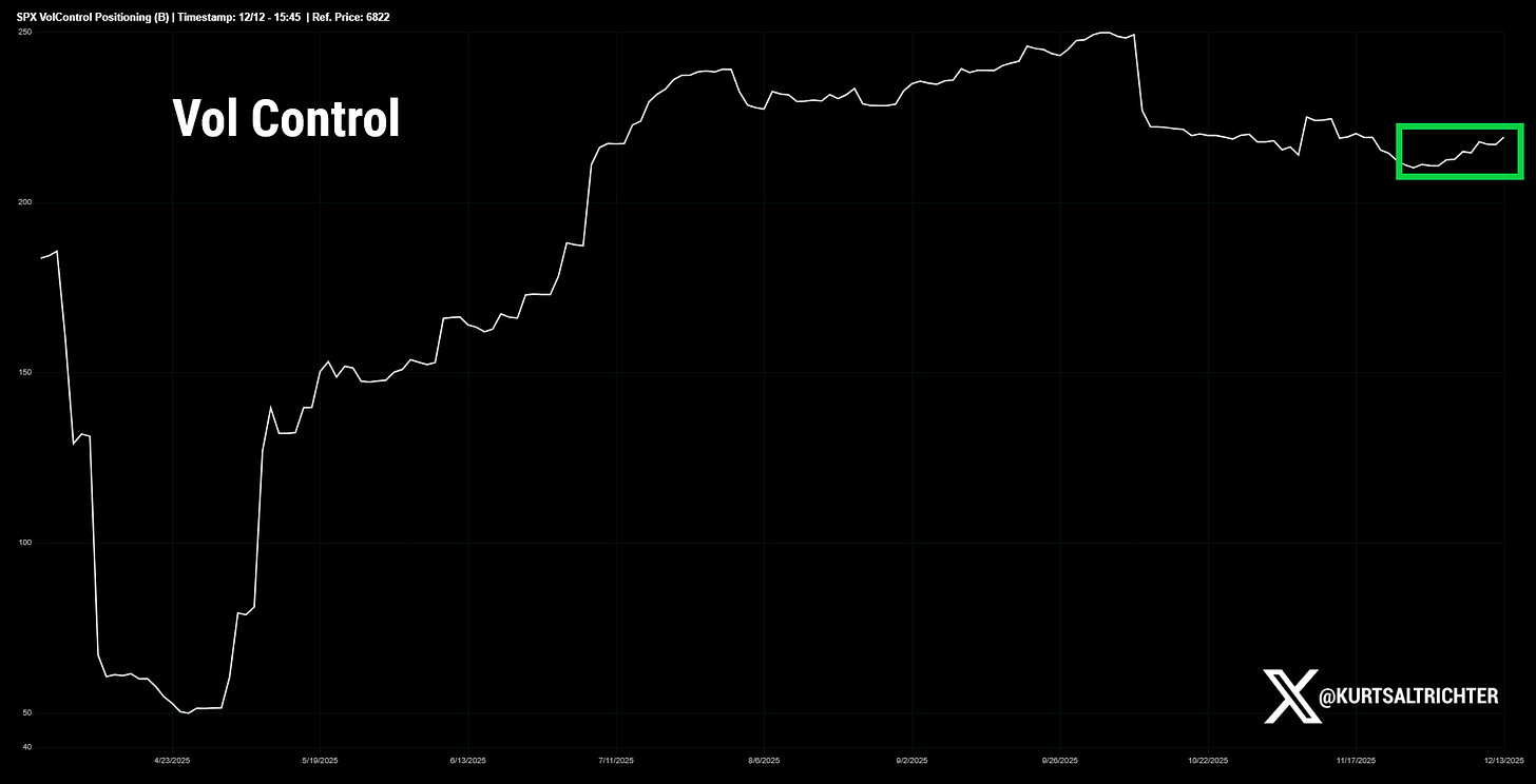 This sequencing matters. Positive gamma cools volatility. Cooling volatility allows vol control to add exposure. That supports price even when CTAs pause.