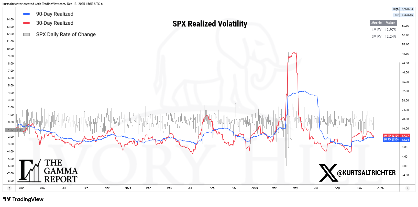 30-day realized volatility ticked back up to 12.97, while 90-day realized volatility sits near 12.24. More importantly, the short-term RV stopped falling. Volatility trades on direction, not level.