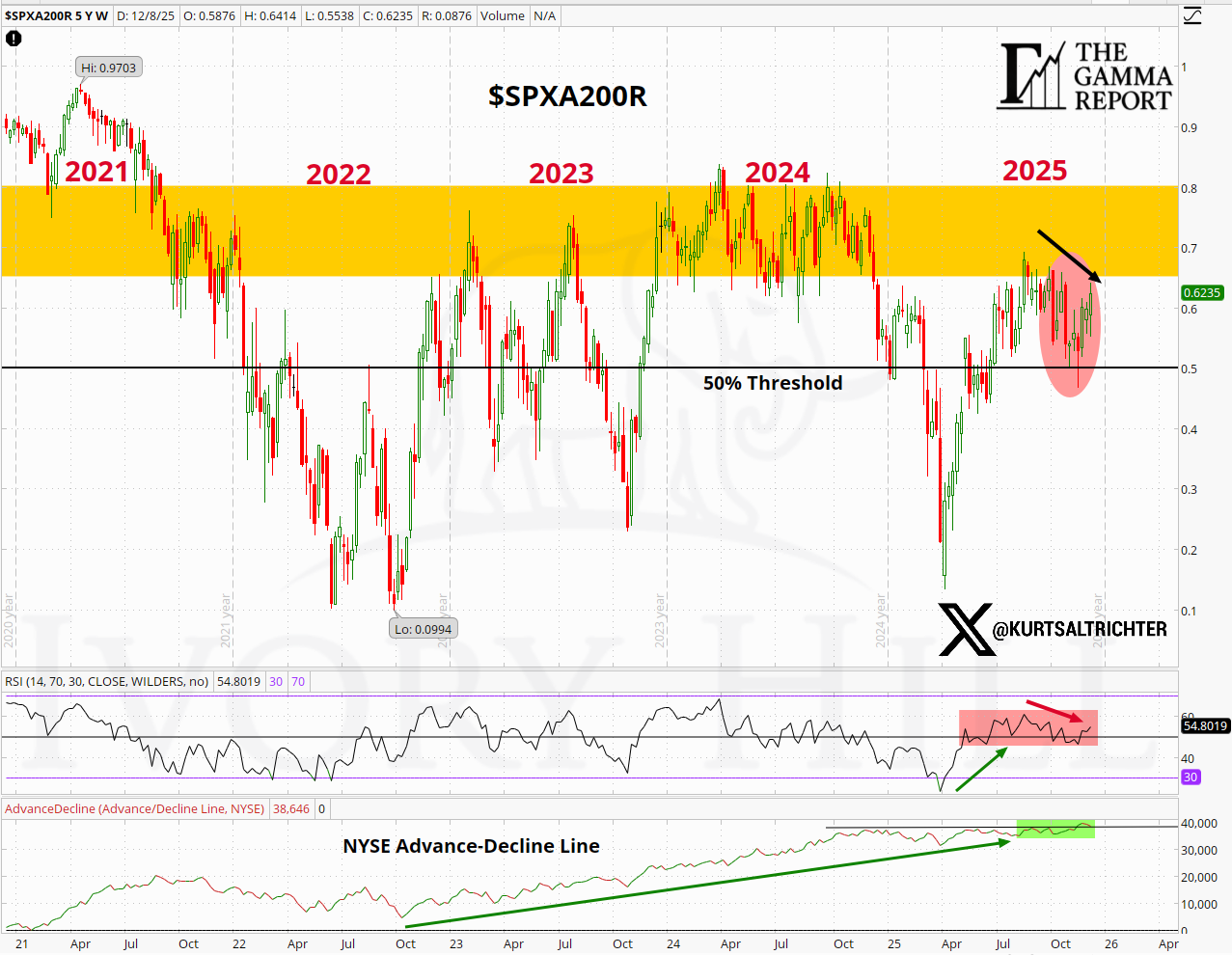 RSI for breadth stabilized above 50 but failed to push into expansion territory. The NYSE advance-decline line continues to trend higher, yet momentum has flattened over the past two weeks. This is an improvement, not confirmation.