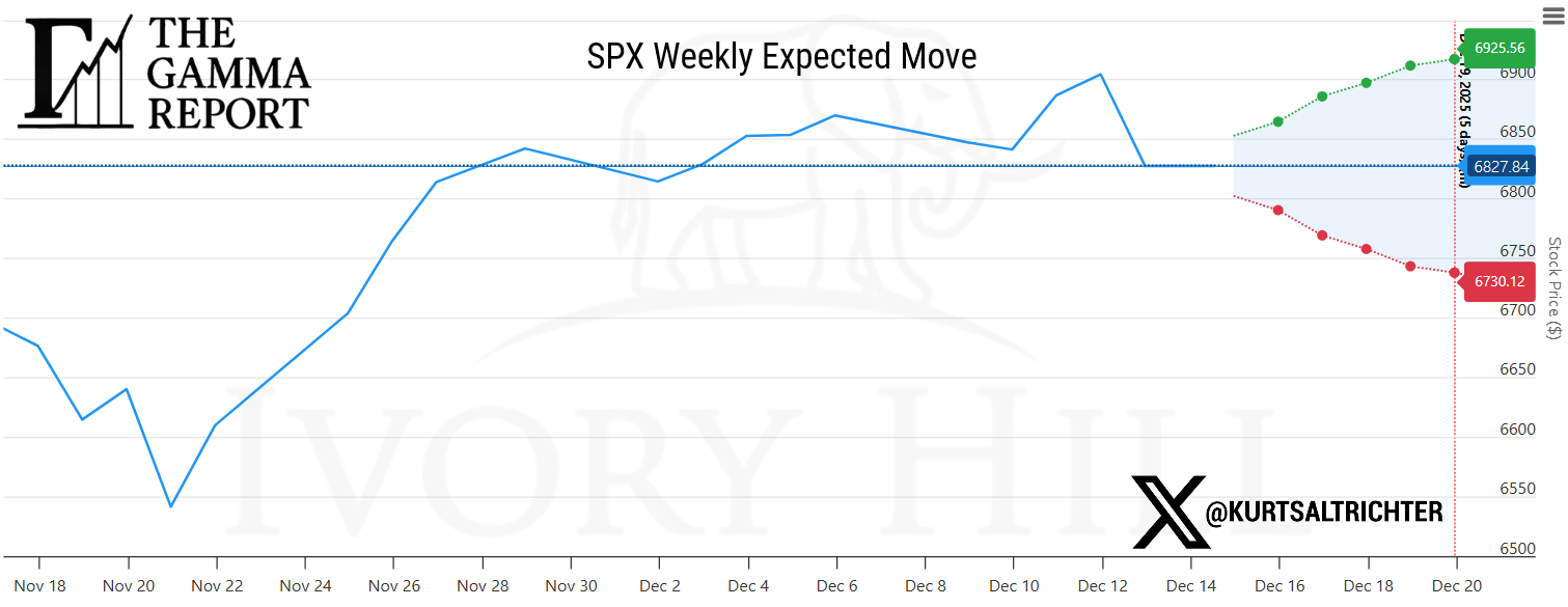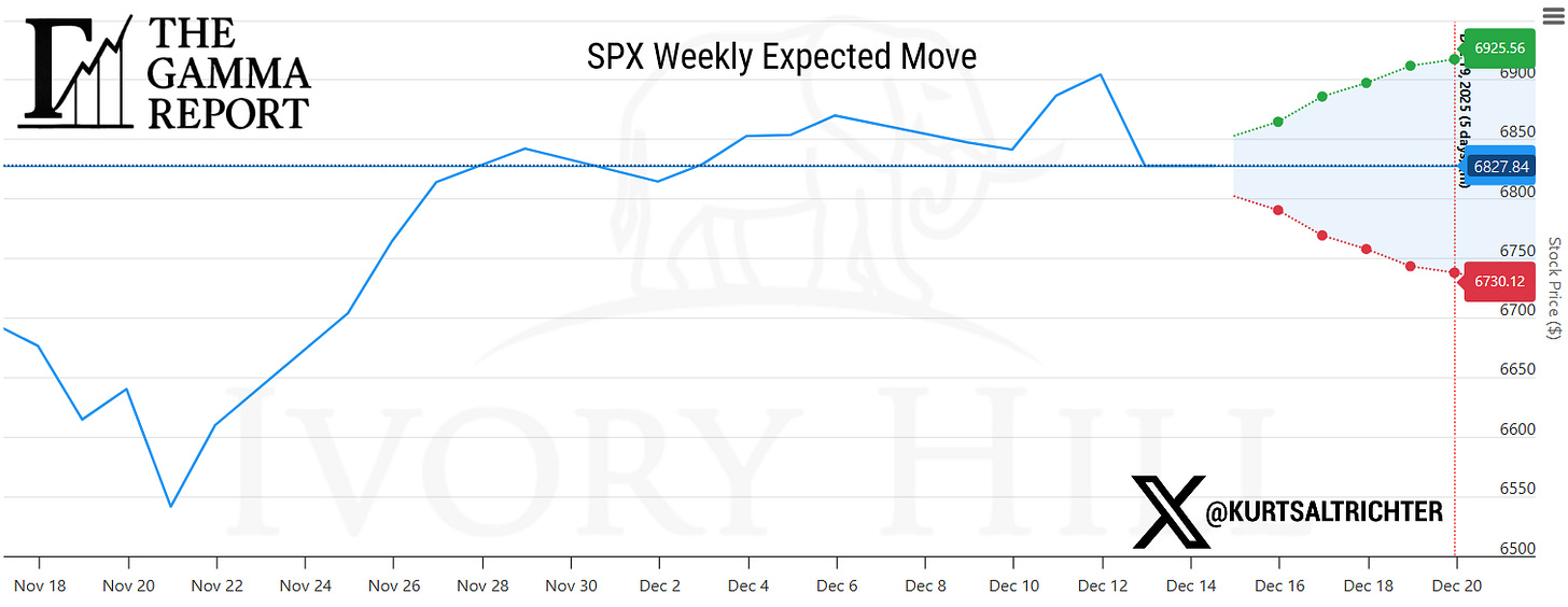 SPX remains above the gamma flip line, which continues to rise and now sits near 6.814. Spot closed the week near 6,827, keeping price in positive gamma territory.