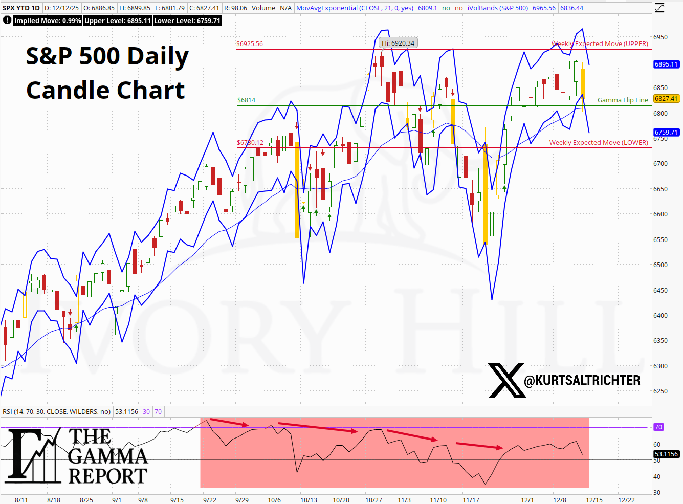The S&P 500 spent the entire week above the gamma flip line and stayed within the expected move lines of last week’s chart.