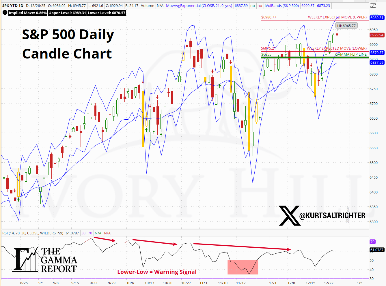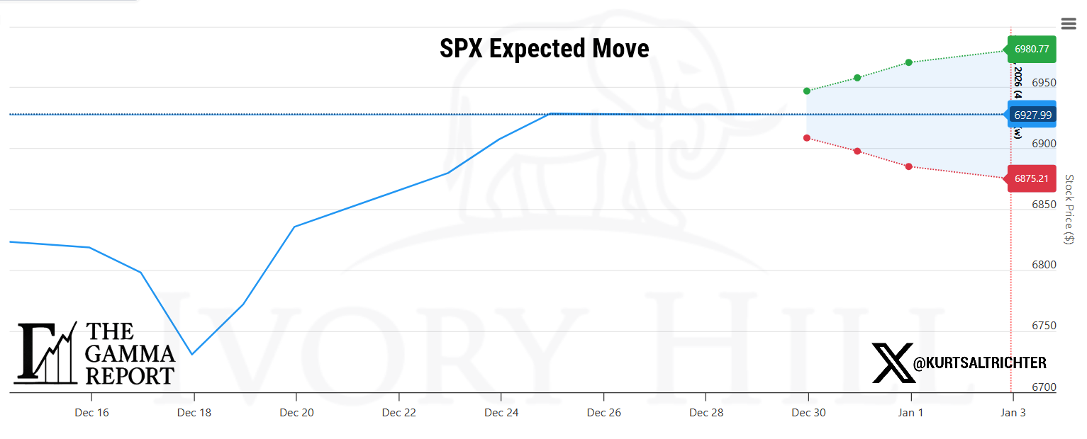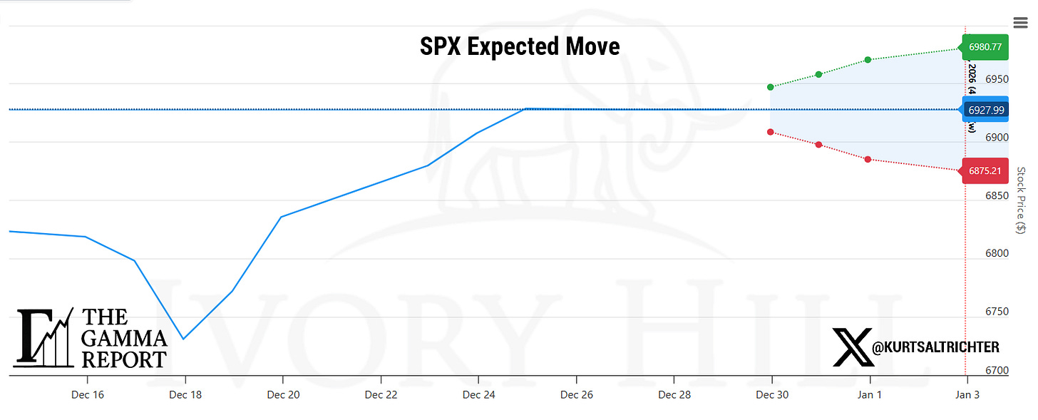 SPX closed Friday at 6,929.94, holding above the Gamma Flip Line near 6,855. That keeps dealers in positive gamma and continues to suppress downside acceleration.