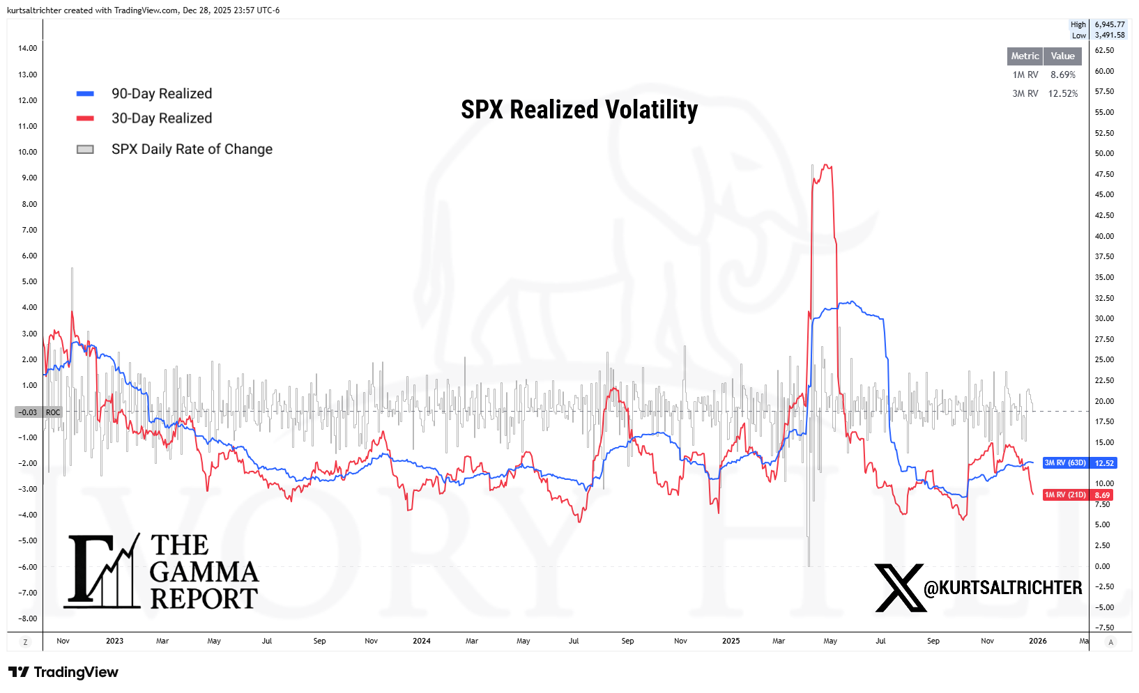 After spending most of December in a tightening, less forgiving structure, the market exited last week with internal support improving across multiple dimensions simultaneously. Gamma stayed supportive, realized volatility declined, systematic flows turned back into a tailwind, and breadth stabilized.