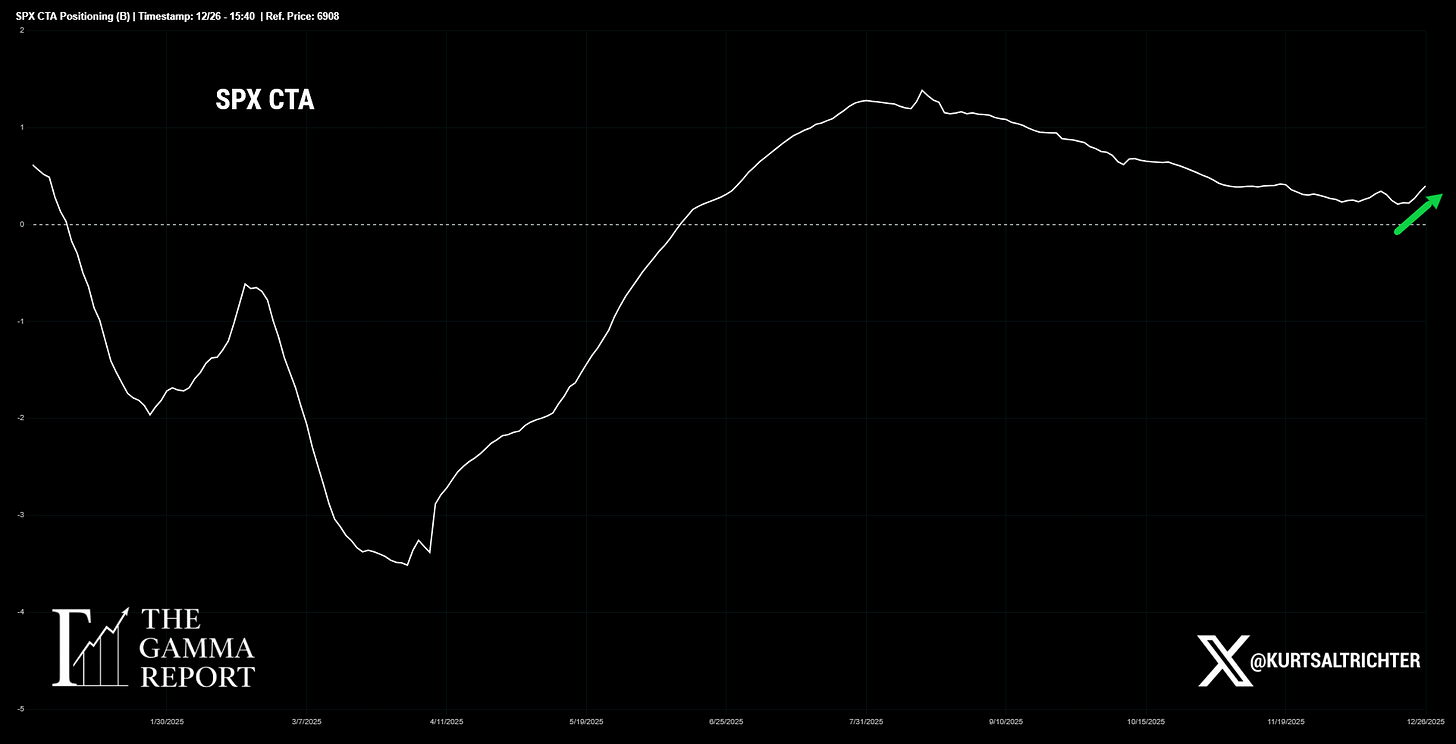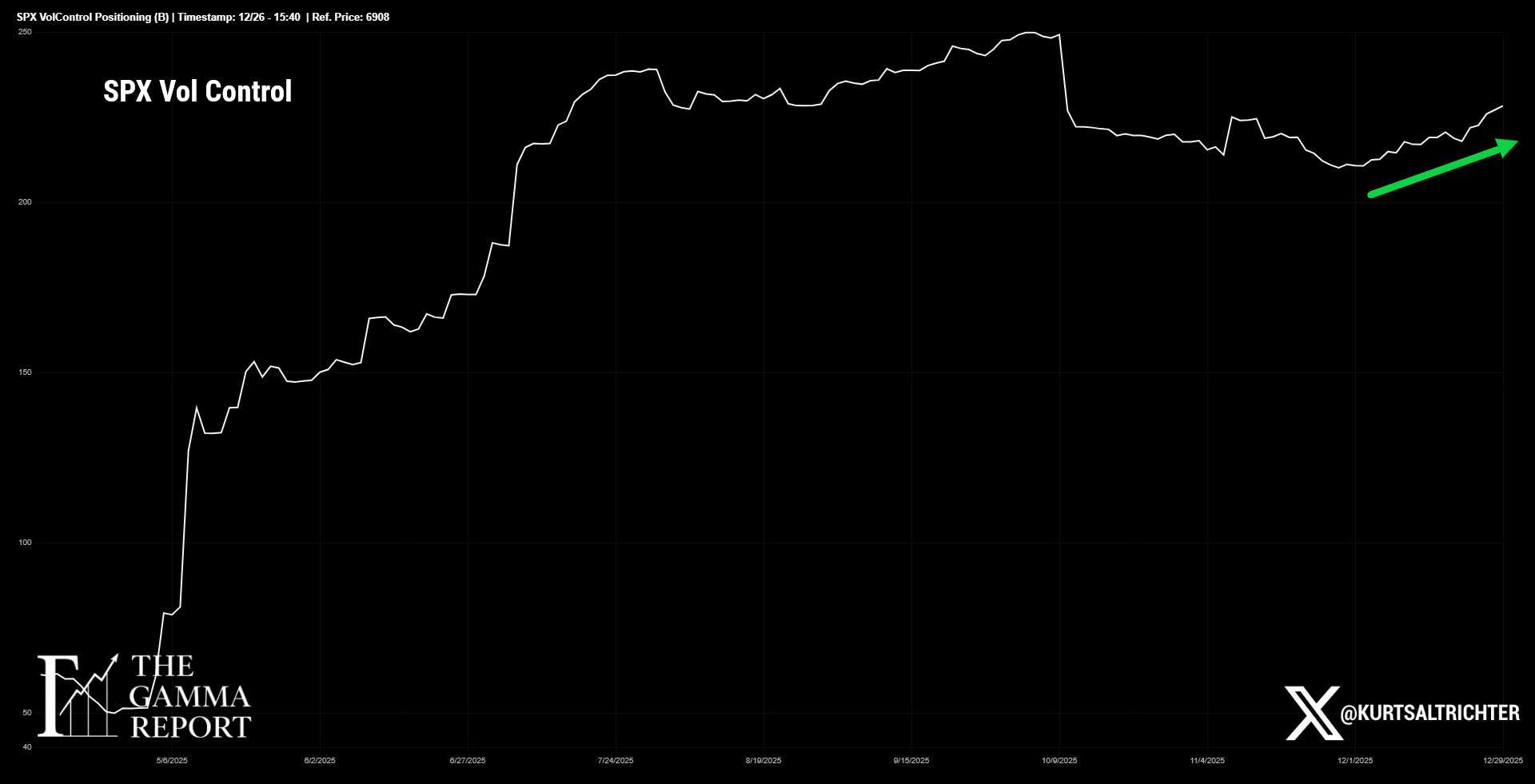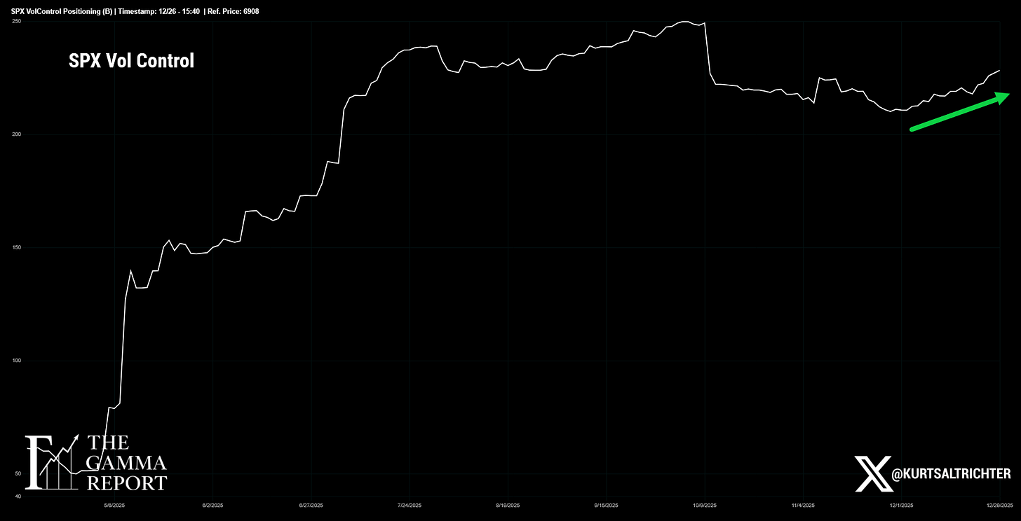 CTA exposure stabilized and began to base, while vol control positioning started to rebuild as realized volatility declined. That combo removes the systematic drag that was present earlier in December.