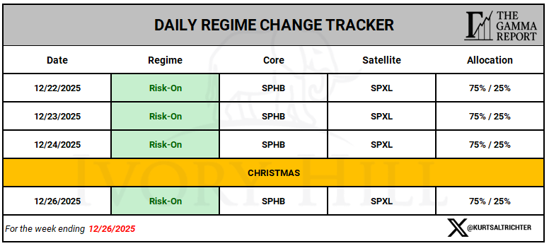 The regime held Risk-On into the 12/26 close, with the allocation unchanged: