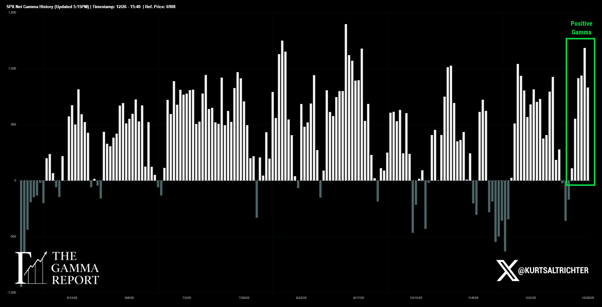 When gamma is positive, dealers hedge against moves rather than with them. That suppresses volatility, slows intraday swings, and forces the market to work harder to trend in either direction.