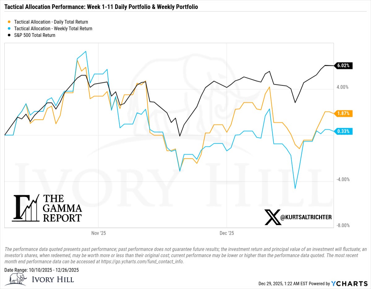The difference versus the index comes from staying rules-based during a slow grind higher. The tactical sleeves were risk-on all week and stayed aligned with the regime rather than reacting to short-term price noise. And there was a lot of worthless noise last week to be bearish on.