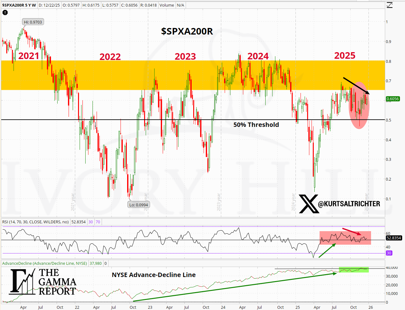 Roughly 60% of S&P 500 constituents remain above their 200-day moving average. That is an improvement from earlier December lows, but it remains inside the same congestion zone that has stopped participation since 2022. This is not a breakout in breadth. I would consider this stabilization.
