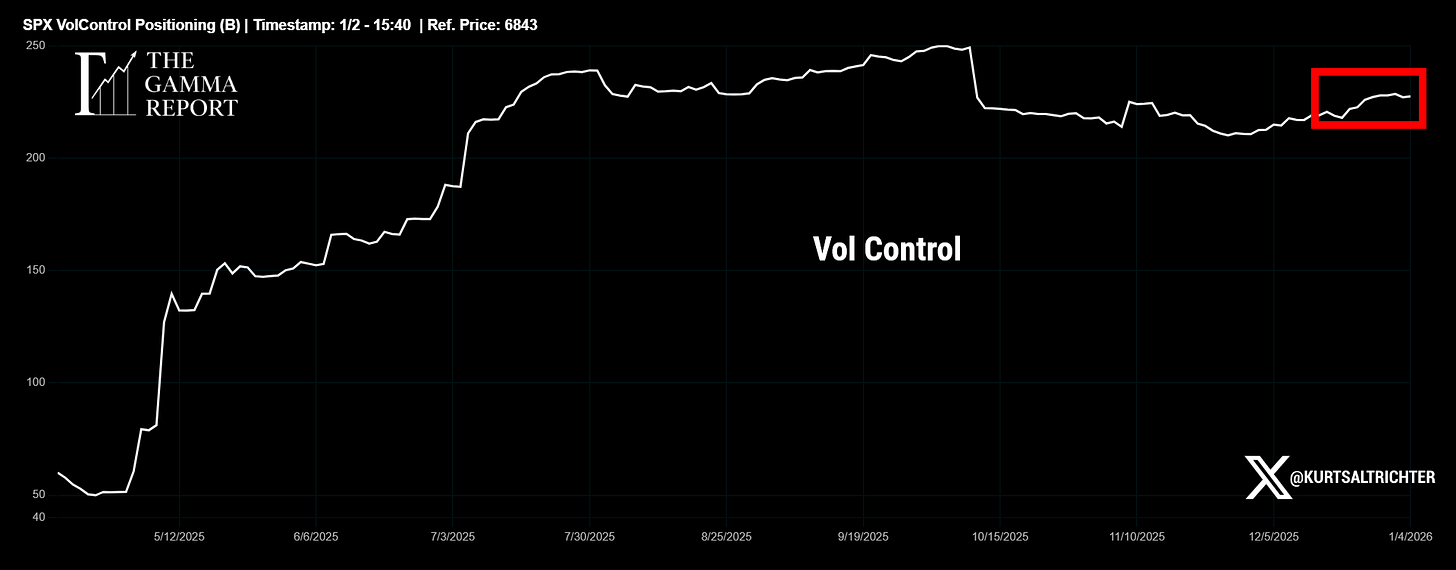 CTA positioning is still on an uptrend but has started to curl down off recent strength, and vol control exposure is rebuilding as well, but is flattening out. That is not a green light for max risk, but it does reduce the odds of immediate mechanical downside amplification.