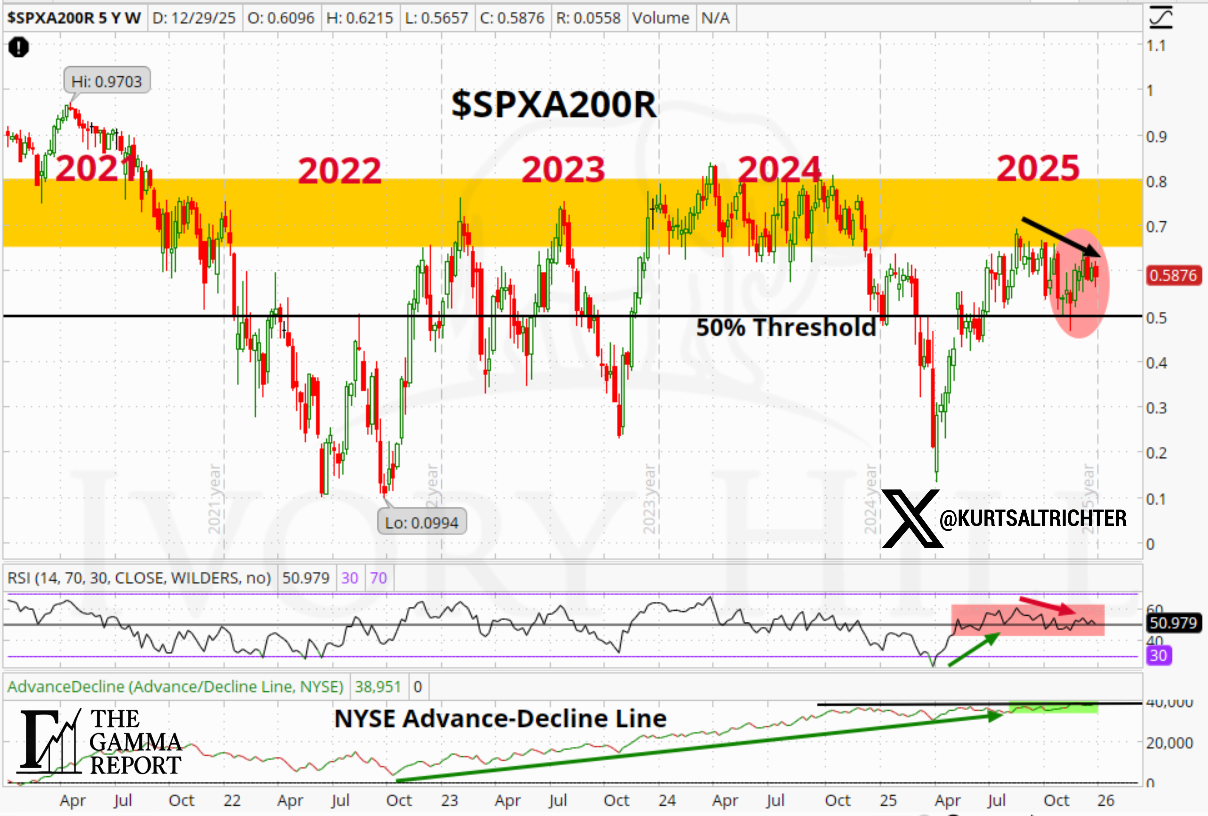 The percent of stocks above the 200-day remains stuck in the same multi-year congestion zone that has capped participation since 2022. The NYSE advance-decline line is still trending higher, which is constructive, but RSI and participation are not screaming “new expansion leg.”