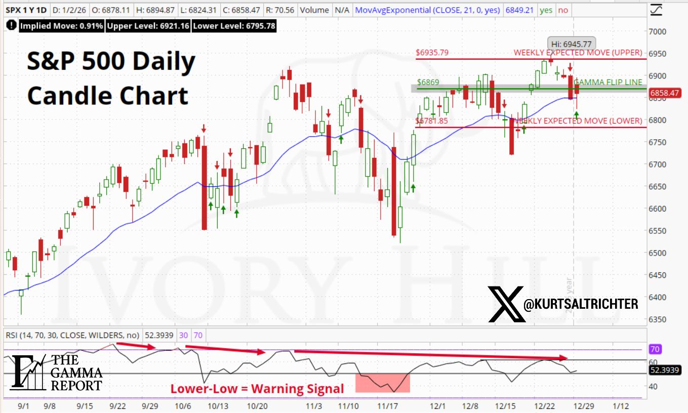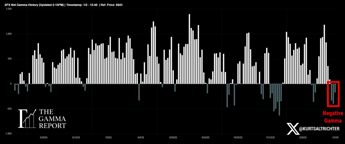 SPX closed 1/2/26 at 6,858.47 with the Gamma Flip Line near 6,869, meaning spot is sitting just below the line.