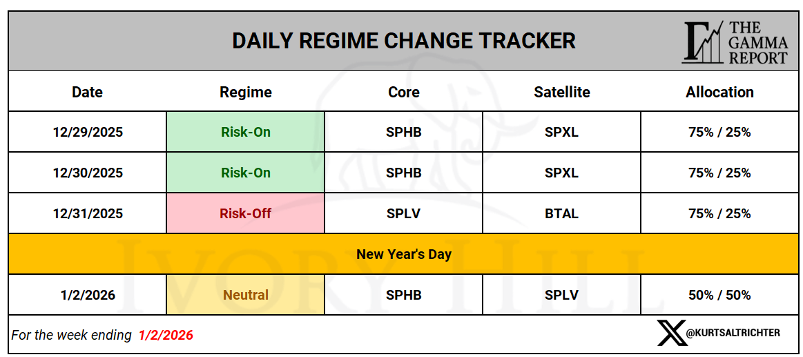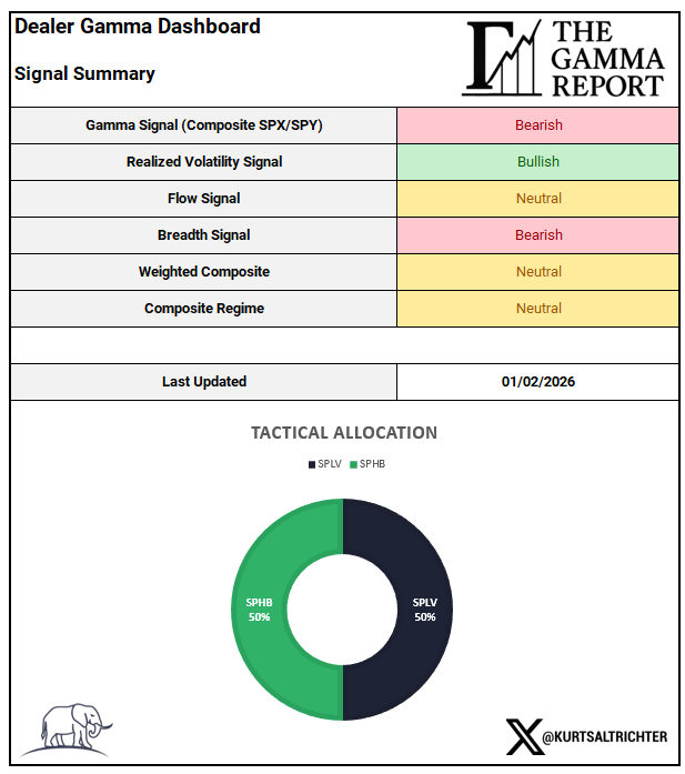 We came into year-end with the market leaning on supportive flows and contained vol. We exit the first session of 2026 with dealer gamma flipping negative, breadth still banging against the ceiling, and the model moving to defense.