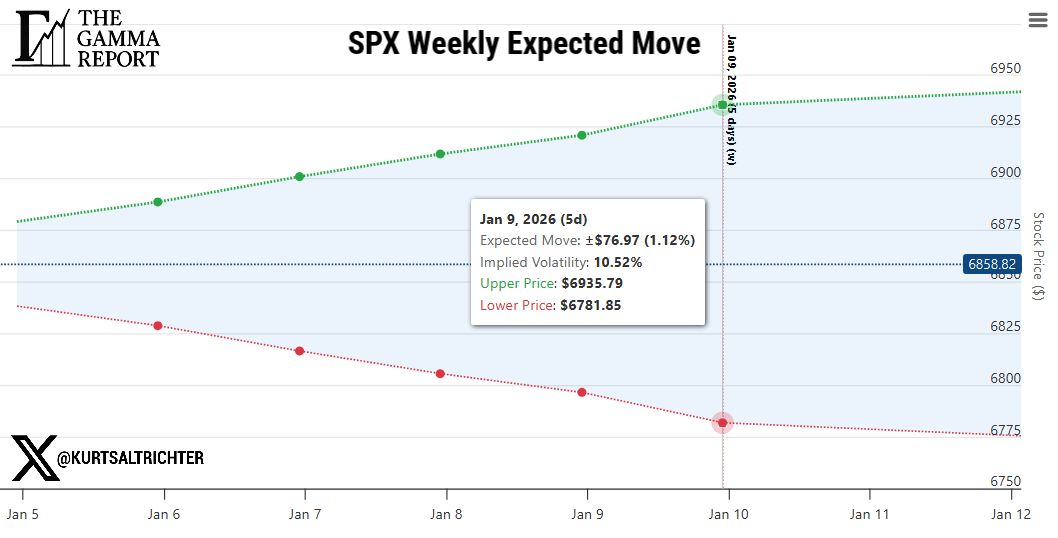 For the week ahead, the expected move is ±76.97 points (1.12%) with: