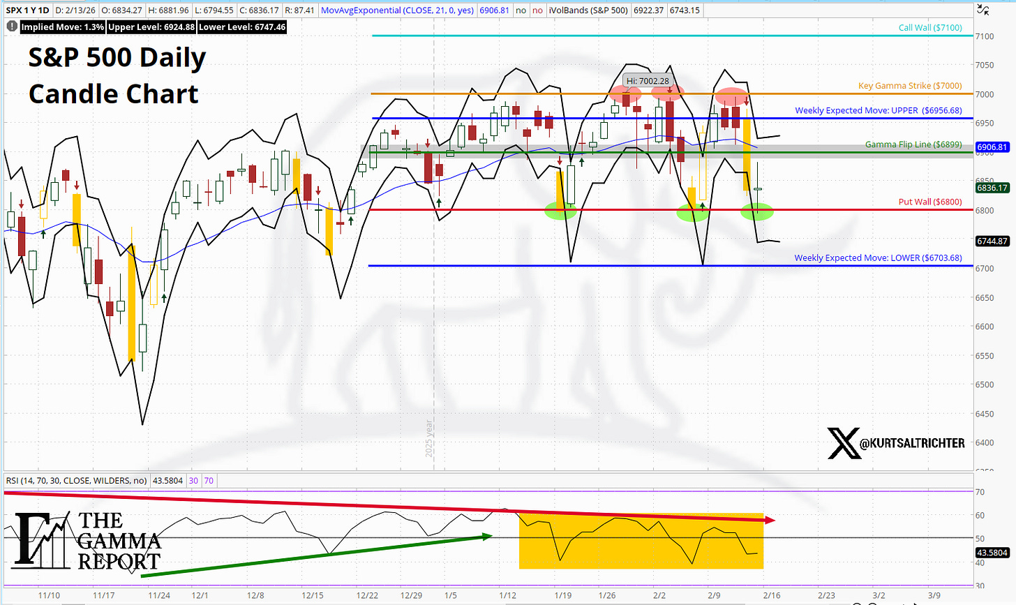 The S&P 500 opened the week at 6,965 and closed Friday at 6,836. That is a 129-point decline, roughly 1.9%. More importantly, it was the manner of the decline that matters. Monday through Wednesday held positive gamma territory, with spot sitting above the flip line. Thursday changed the structure. SPX sliced below the gamma flip level and stayed there. Dealers went from suppressing volatility to amplifying it. That is not a prediction. That is mechanics.
