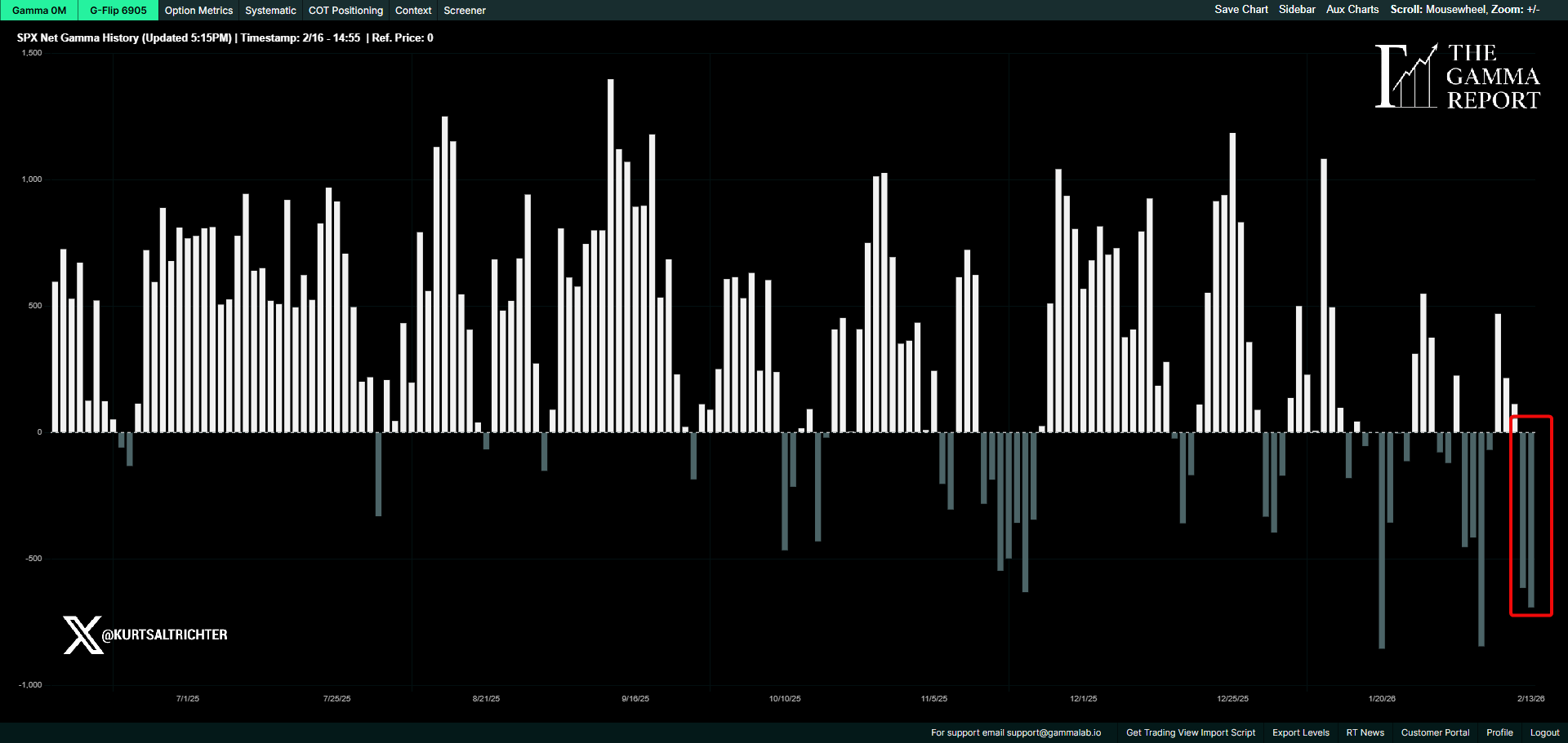 SPX closed Friday at 6,836. The gamma flip line sits at 6,905. That puts spot 69 points below the threshold, firmly in negative gamma territory.