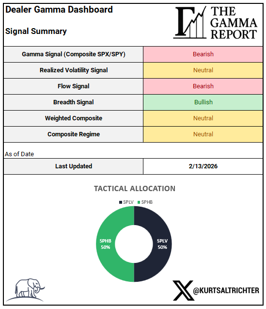 The model shifted from a Risk-On posture (75% SPHB / 25% SPXL) to a Neutral posture (50% SPLV / 50% SPHB) mid-week when gamma flipped negative, and the composite dropped below the Risk-On threshold.